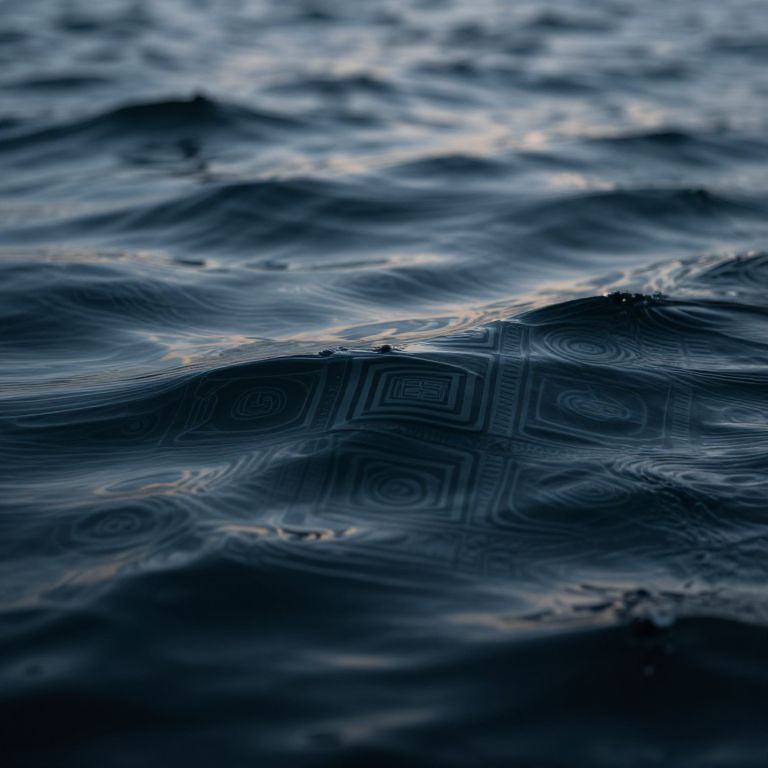 Skindentation as a mysterious abstract pattern emerging from a stormy sea surface, waves rippling with geometric designs, dark ocean depths revealing ancient symbols, surreal and dreamlike, soft volumetric lighting, depth of field, high contrast.
