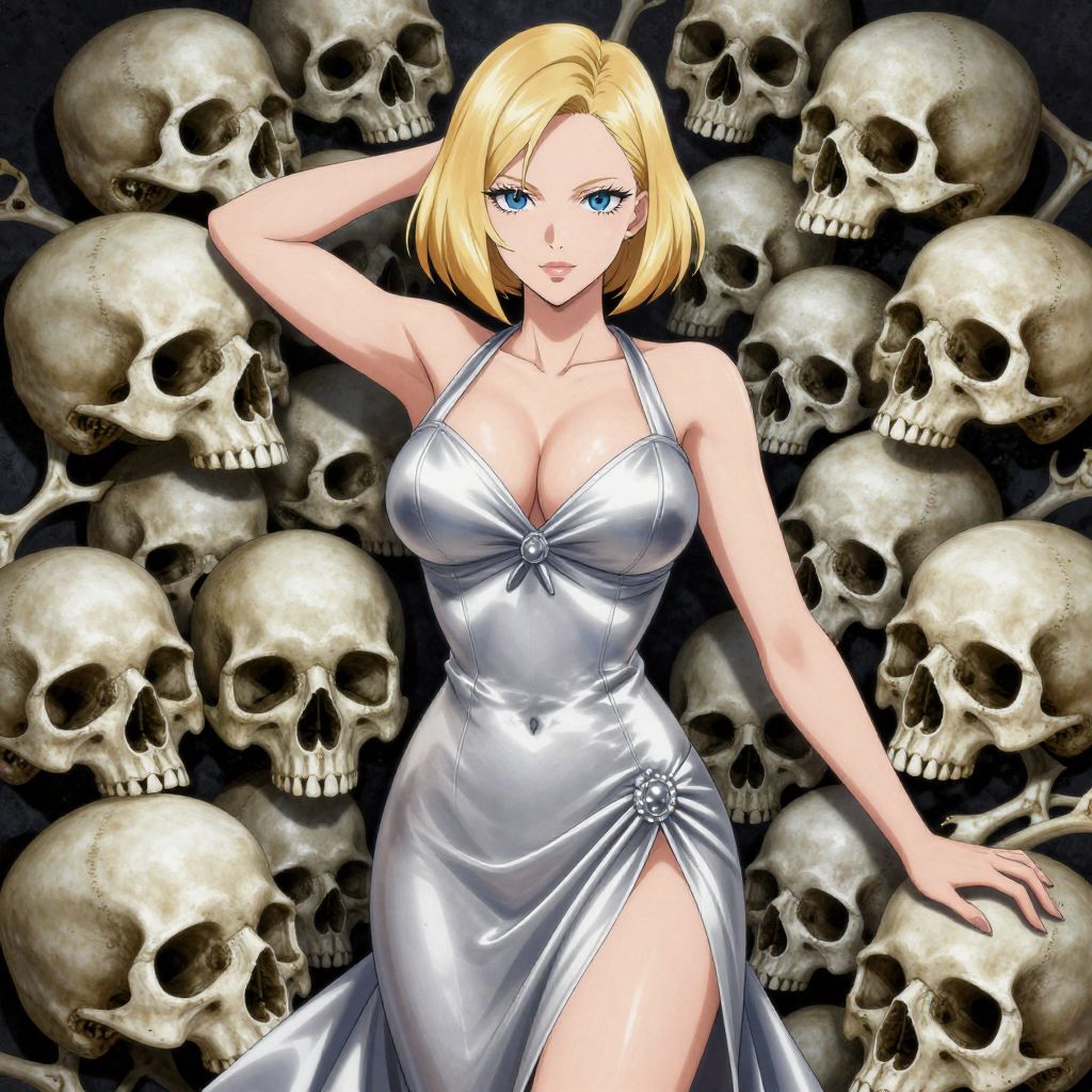 A sensuous woman wearing sexy elegant silver dress surrounded by a pile of human skulls, The woman's alluring gaze and sensual pose convey a sense of cold, calculated evil, She has is busty and has blonde hair, bob cut and blue eyes, The juxtaposition of the organic human skulls with sexy pose of the woman emphasizes the deadly impact of beauty and femme fatale, The overall atmosphere is one of redemption and holy energy, reflecting the salvation and sci-fi themes, animemartz, animesource, anime, cyberpunk