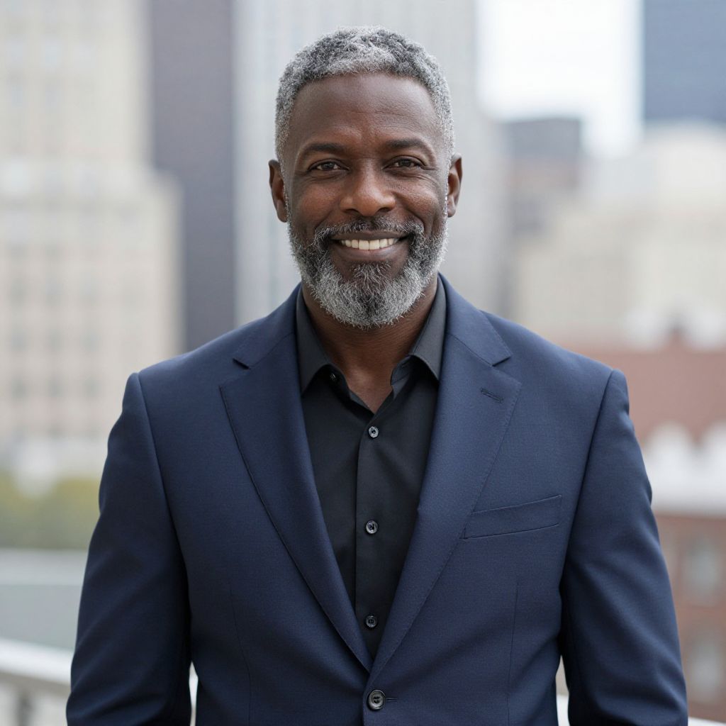 Photograph of a middle-aged Black man with a dark complexion and short, graying hair and beard. He is smiling broadly, showing his teeth. He is wearing a dark navy blue, single-breasted suit jacket over a black button-up shirt, with the top button undone. The background is blurred, featuring an urban skyline with tall buildings and a mix of light and dark colors. The lighting is natural, highlighting his facial features and creating a soft shadow under his jaw. The overall mood is professional and approachable.