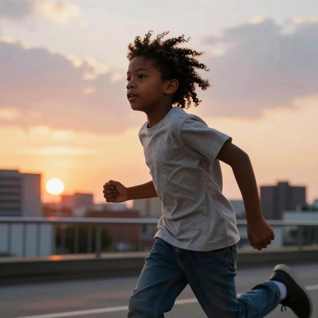 11 year old black boy with dreads riding a bicycle down a suburban neighborhood street during golden hour, casual attire with dynamic motion blur, warm lighting highlighting his focused expression and joyful spirit.