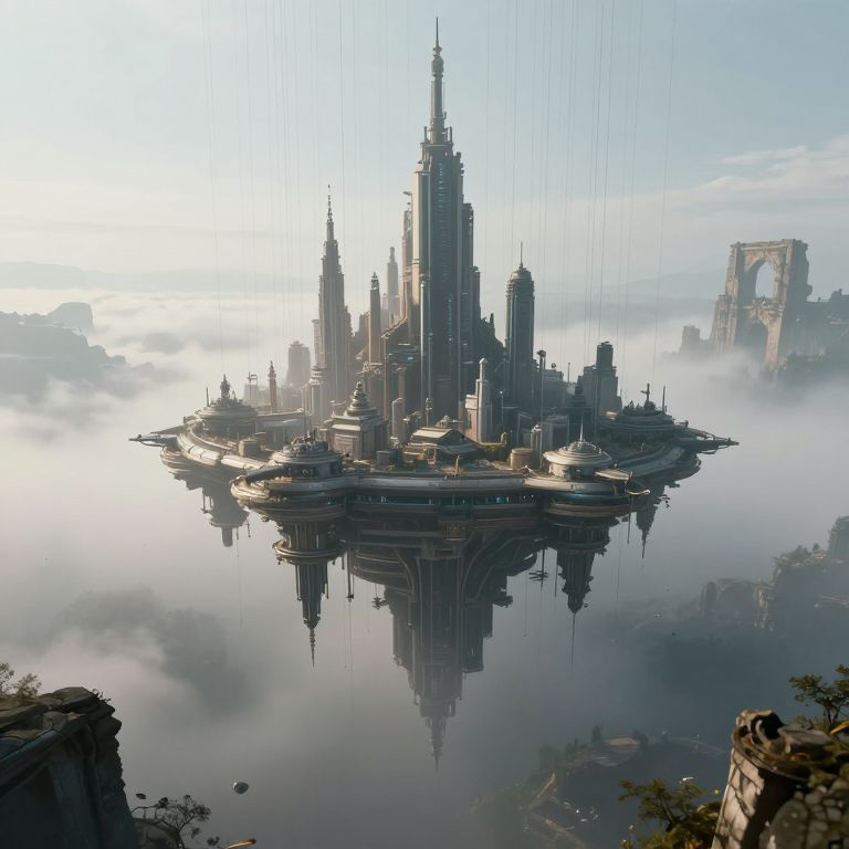 Digital artwork of a futuristic, floating city with towering spires, reflected in a calm, misty lake, with a distant, partially ruined bridge.