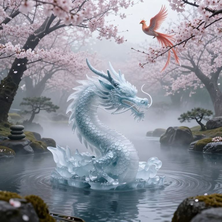 Imagine an ethereal Japanese Zen garden shrouded in morning mist, where an awe-inspiring ice dragon gracefully rises from its pond. The dragon's scales shimmer with dewdrops, catching the soft light filtering through cherry blossom trees that encircle the tranquil space. This captivating fusion of traditional Japanese artistry and whimsical fantasy is captured from a high vantage point, as if seen by a nearby phoenix perched on blossoming branches. The image harmoniously blends serenity and wonder, showcasing the delicate equilibrium between nature's splendor and mythical imagination in this enchanting tableau.