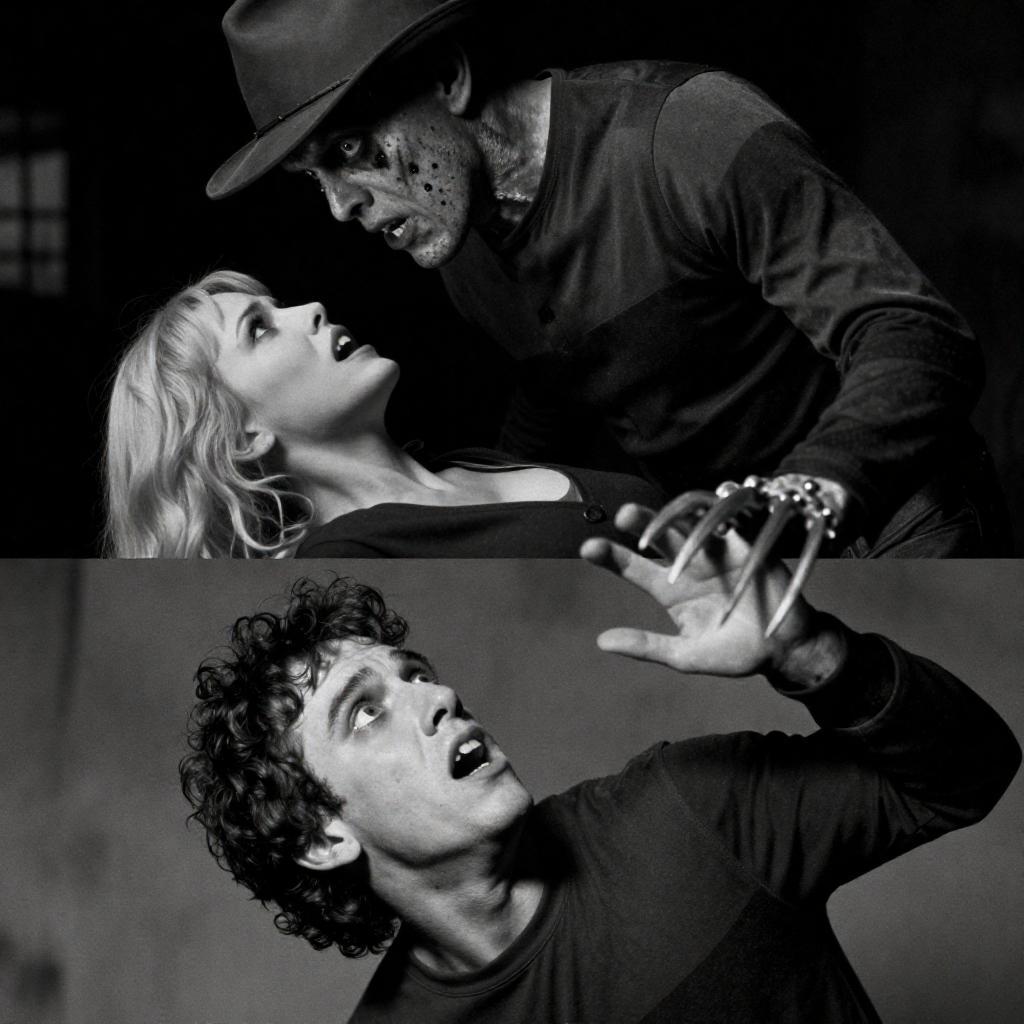 Black and white movie poster of "A Nightmare on Elm Street 4: The Dream Master." Top: Freddy Krueger, with sharp claws and a hat, leans over a screaming woman with blonde hair. Bottom: Freddy lunges at a man with curly hair, eyes wide in fear, as he looks up at Freddy's clawed hand. Two characters, intense expressions, horror theme.