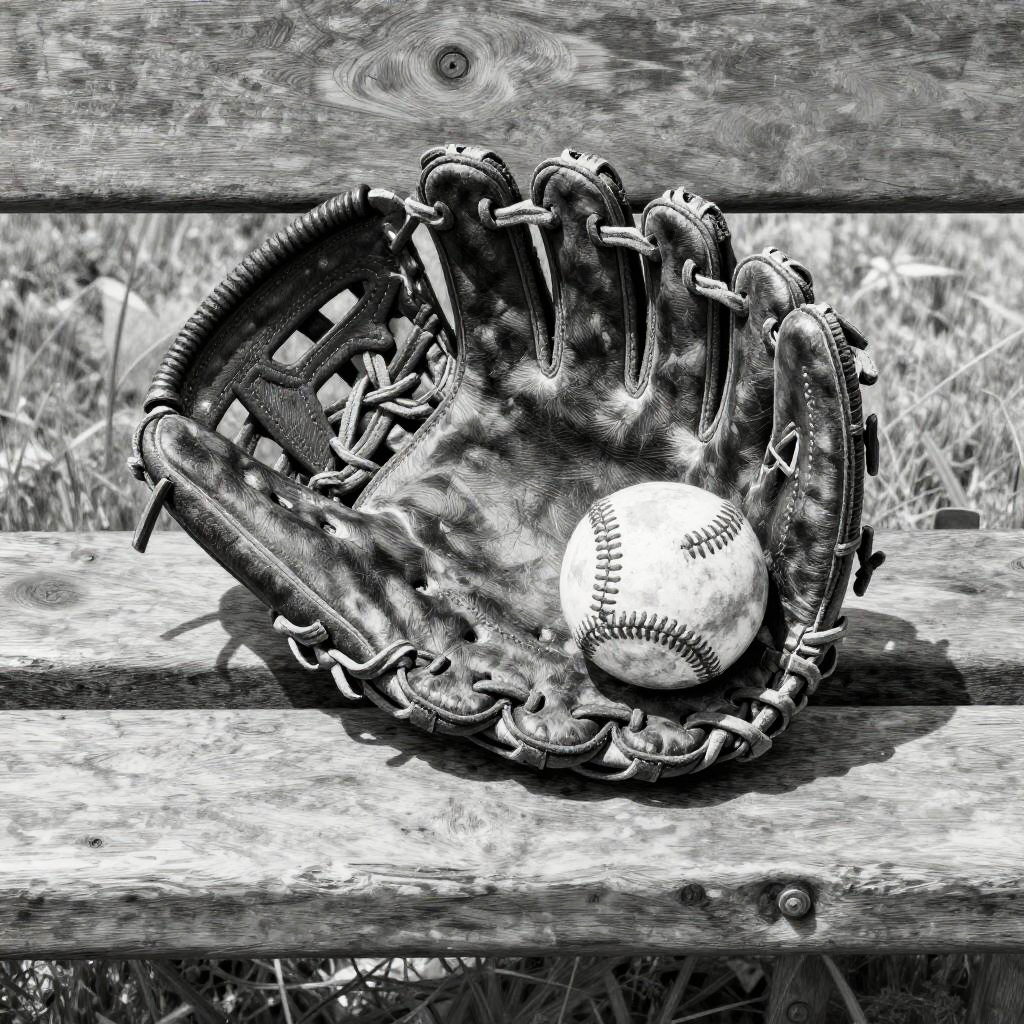 Baseball pencil drawing depicting a vintage glove and ball resting on a wooden bench, cross-hatching techniques highlighting wear and texture, nostalgic monochrome sports art.