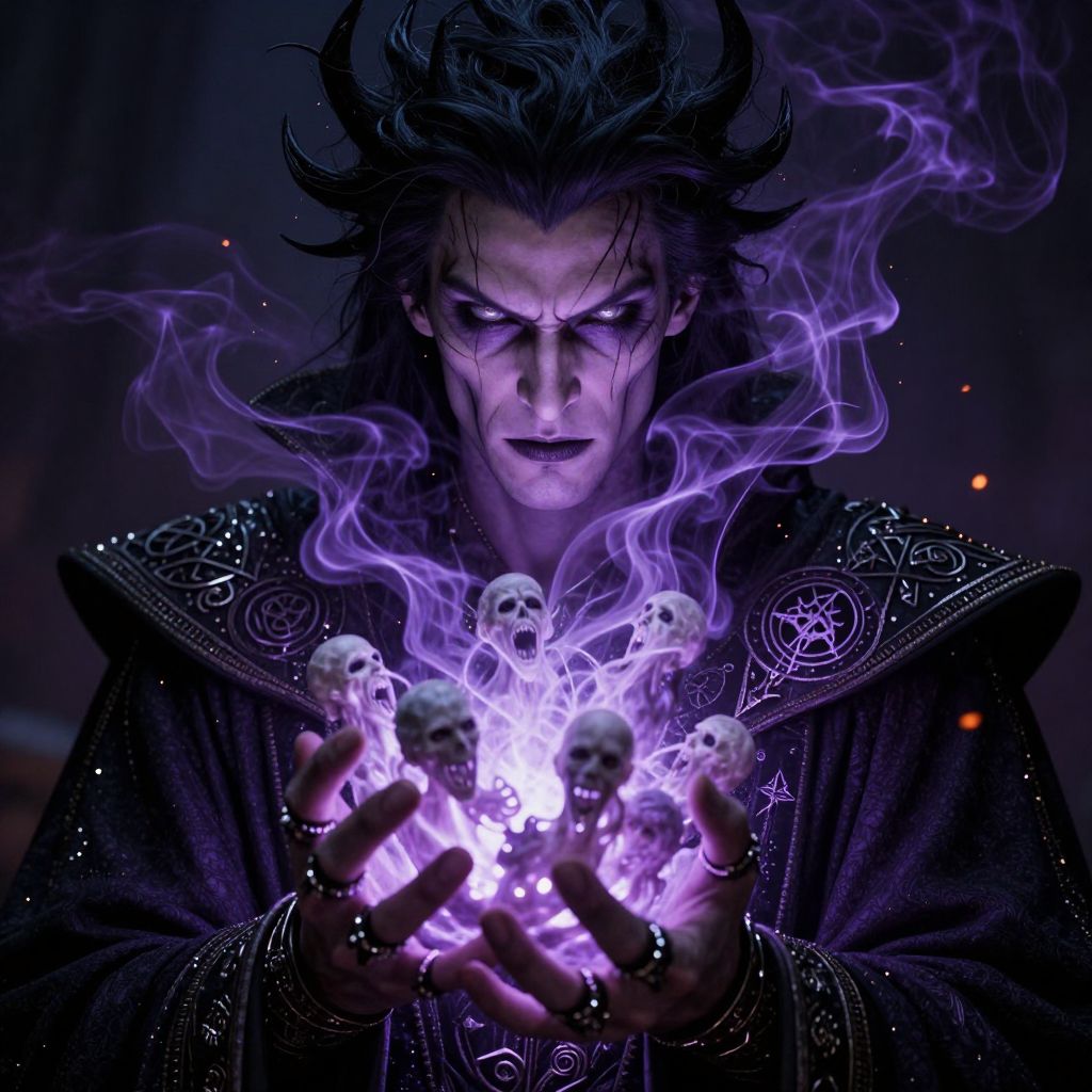 This digital artwork depicts a dark, brooding figure with wild, black, spiky hair and pale, intense eyes, conjuring glowing purple flames. The figure's face is heavily shadowed, emphasizing a sinister expression. They wear a dark, ornate robe adorned with intricate, glowing white patterns. In their hands, they hold several small, glowing skulls surrounded by the purple flames. The background is dark and smoky, with faint orange embers adding depth. The overall mood is mysterious and ominous, with a strong contrast between the dark figure and the bright purple flames. The image is highly detailed and uses dramatic lighting to enhance the supernatural atmosphere.