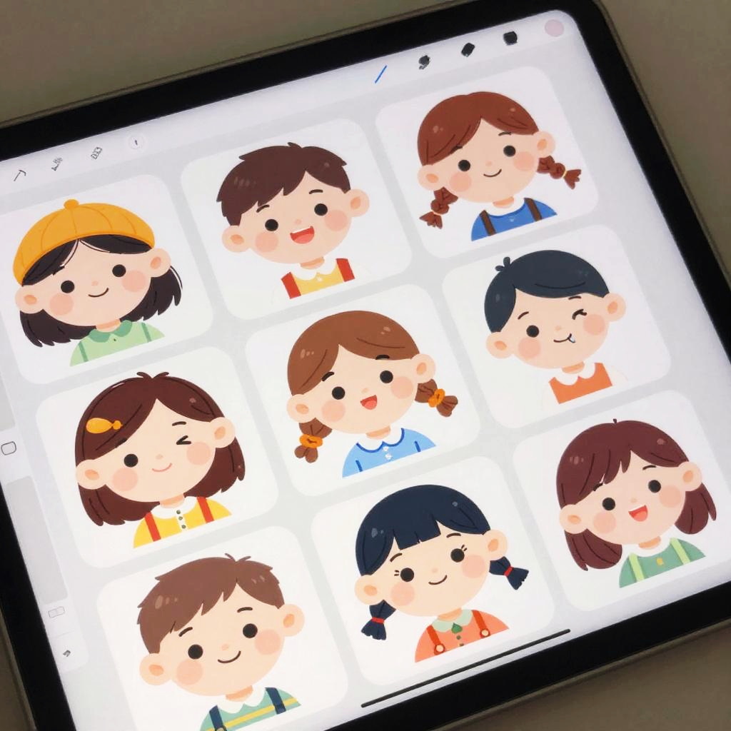 Creative free cartoon character maker app, close-up of a digital tablet screen showing character design options like faces, clothes, and expressions, soft pastel color scheme, cute and whimsical cartoon style, interactive and dynamic user experience illustration
