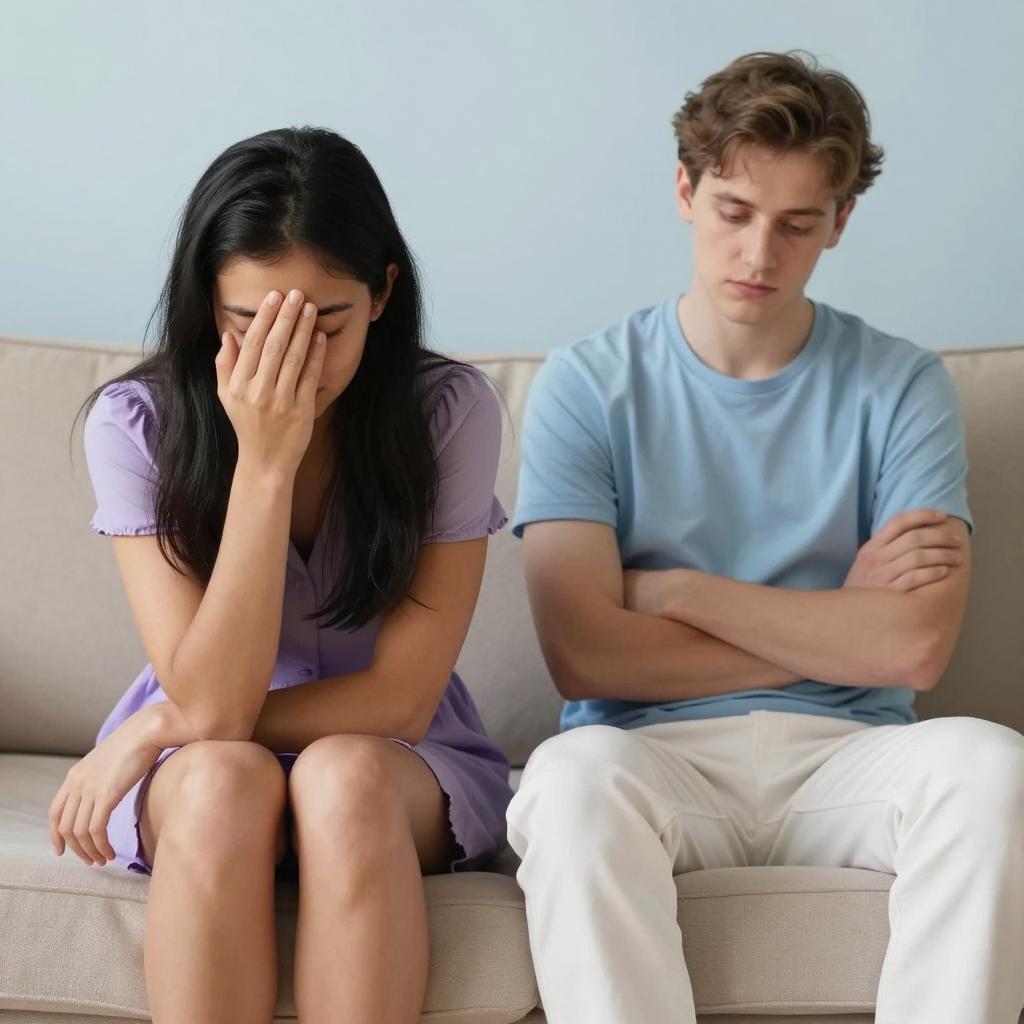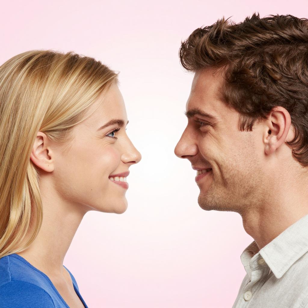 Photograph of two young men. Blonde man with short hair, blue eyes, wearing black-and-white checkered shirt, smiling, looking at mirror. Shirtless man with dark hair, back to camera, left side. Mirror on left, white wall and blue curtains on right. Blonde man gestures with right hand.