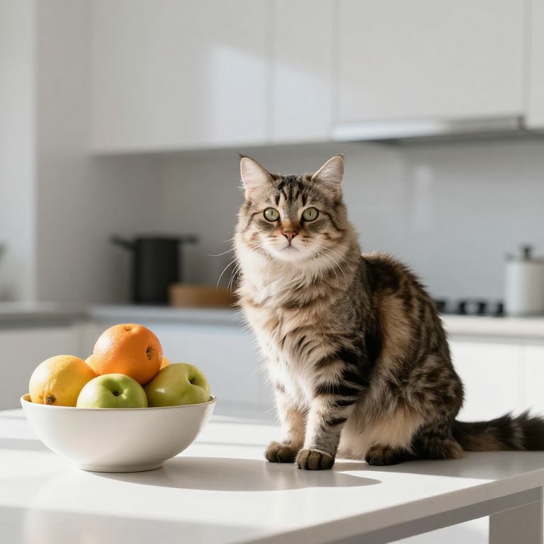 Cat sitting on table beside a bowl of fresh fruit, natural daylight casting gentle shadows, modern bright kitchen, sleek minimalistic design, sharp focus on cat's curious eyes and fluffy fur, photorealistic style