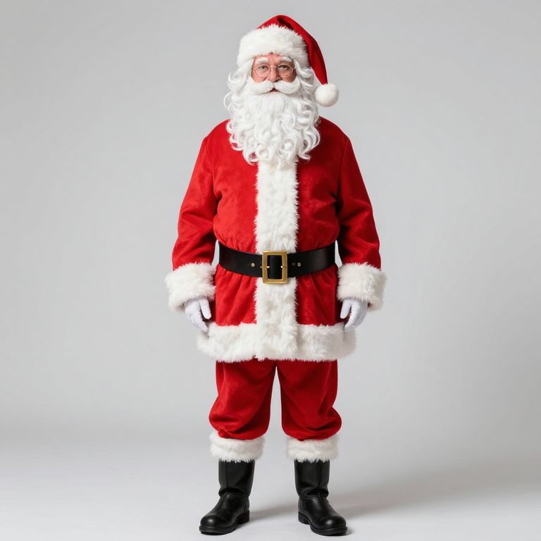 Male santa claus outfit with a red coat, black pants, and a white beard.
