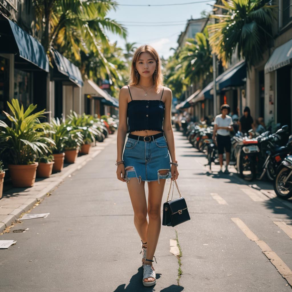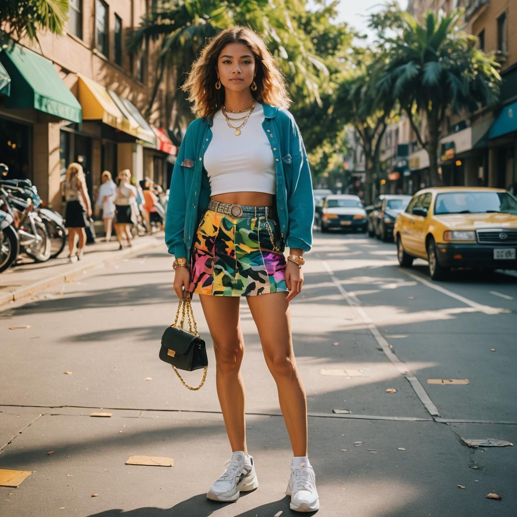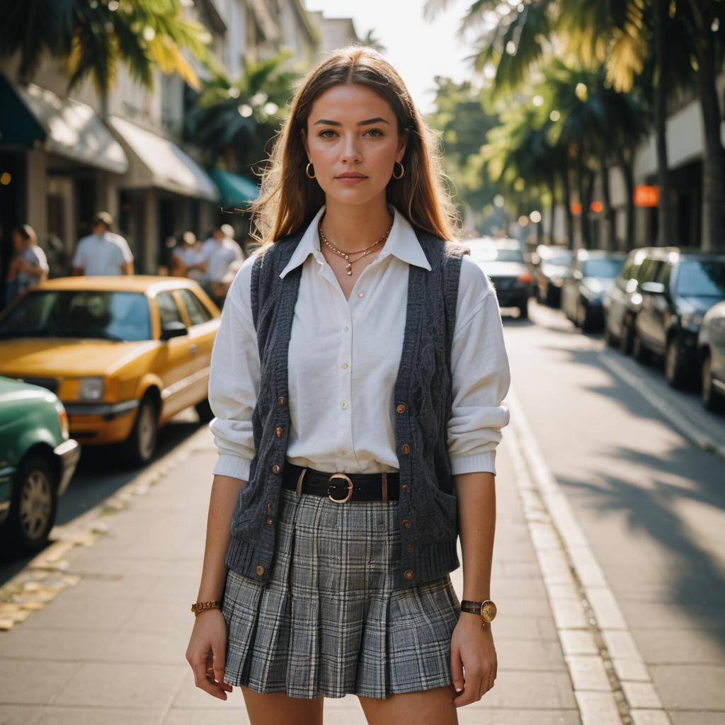Trendy teenage fashion ideas, full-body, sunlit photograph showcasing a youthful street style ensemble. The subject is big breasts woman, wearing a chunky knit vest over a white collared shirt and a patchwork denim mini-skirt. Accessories include a simple gold necklace and platform combat boots with thick soles. The scene is a sun-drenched sidewalk with blurred tropical foliage in the background. Y2K fashion, trendy, street photography, realistic, high detail.