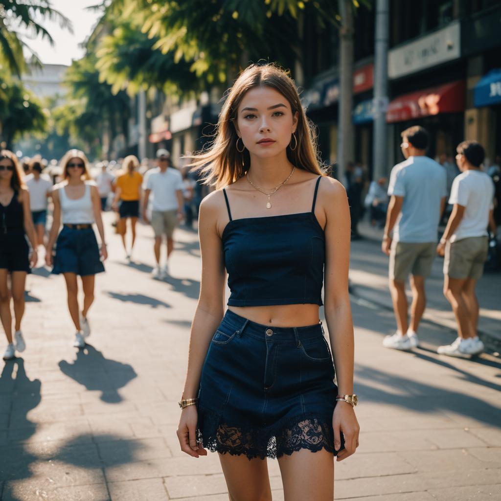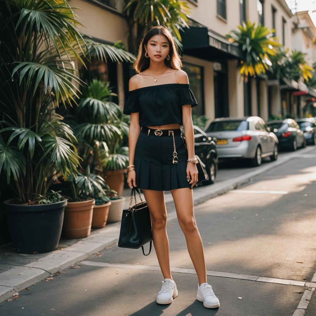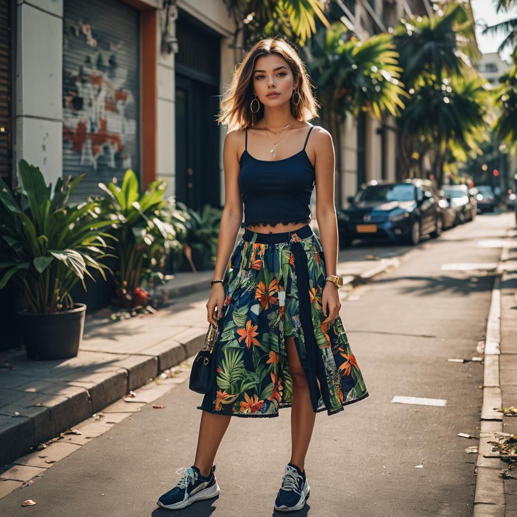 Trendy teenage fashion ideas, full-body, sunlit photograph showcasing a youthful street style ensemble. The subject is big breasts woman, wearing a chunky knit vest over a white collared shirt and a patchwork denim mini-skirt. Accessories include a simple gold necklace and platform combat boots with thick soles. The scene is a sun-drenched sidewalk with blurred tropical foliage in the background. Y2K fashion, trendy, street photography, realistic, high detail.