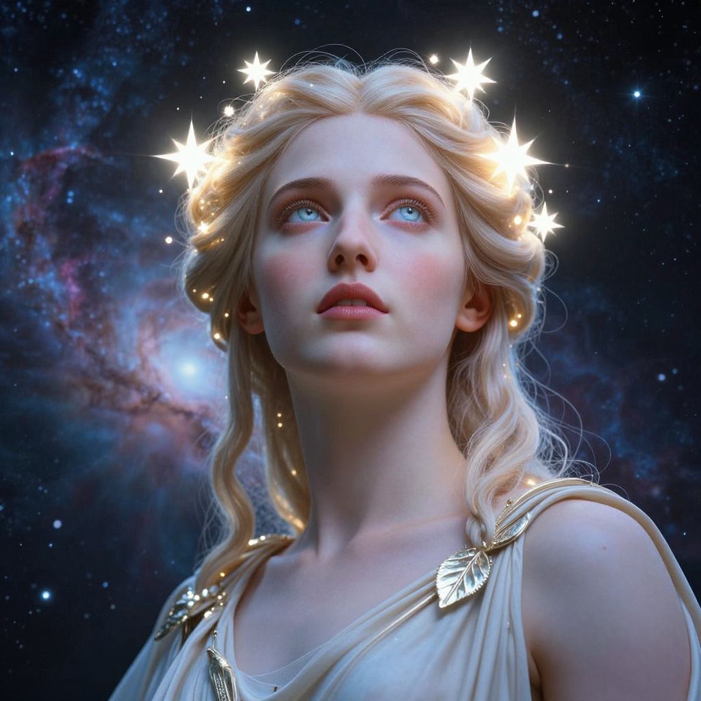 Photographic-style digital art depicting a fair-skinned, blonde woman with wavy hair, wearing a white, sleeveless, ancient Greek-style dress adorned with gold leaf accents. Her head is crowned with glowing white stars against a deep space background filled with galaxies and stars. She has blue eyes, a delicate nose, and full lips, gazing upward with a serene expression. The background is a blend of dark blues and purples, with a nebula-like texture, adding a mystical, celestial atmosphere to the image. The lighting highlights her ethereal beauty and the luminous stars on her crown.
