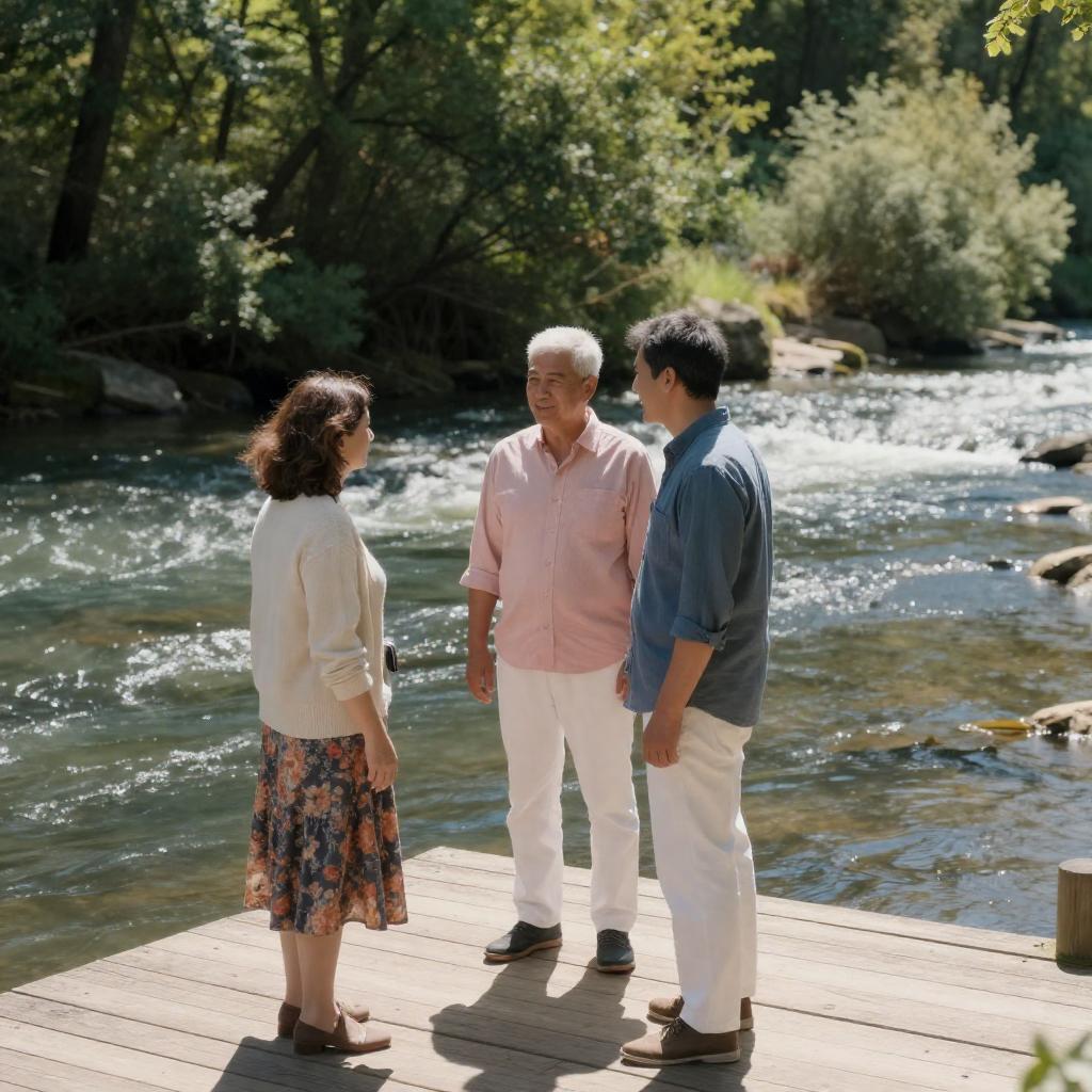 Photograph of three people on a wooden dock by a sunlit, sparkling river. A woman with brown hair, wearing a beige cardigan and floral skirt, stands on the left. A man in a pink shirt and white pants stands in the center, smiling. Another man in a blue shirt and white pants stands close to him on the right. Dense green trees and rocky shore are in the background.