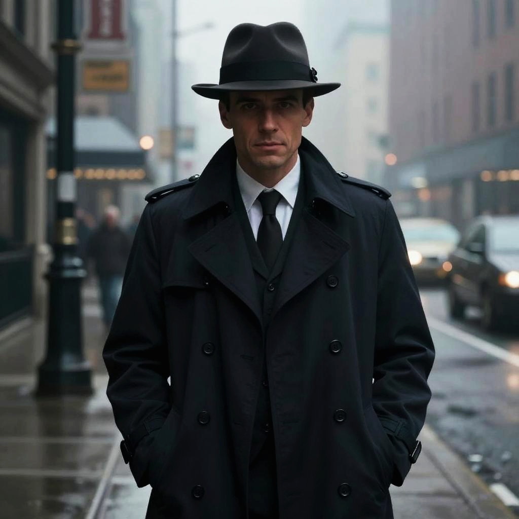 Brooding noir detective crow in a trench coat in dark rain-soaked urban alley with flickering streetlight, emerald cannabis symbols glowing in the background, moody film noir graphic novel style; ultra-detailed textures, expressive lighting, cinematic composition, smoke trails forming glyphs, high contrast, SDXL high fidelity, polished finish, atmospheric depth, cohesive color palette, subtle film grain, reflective surfaces