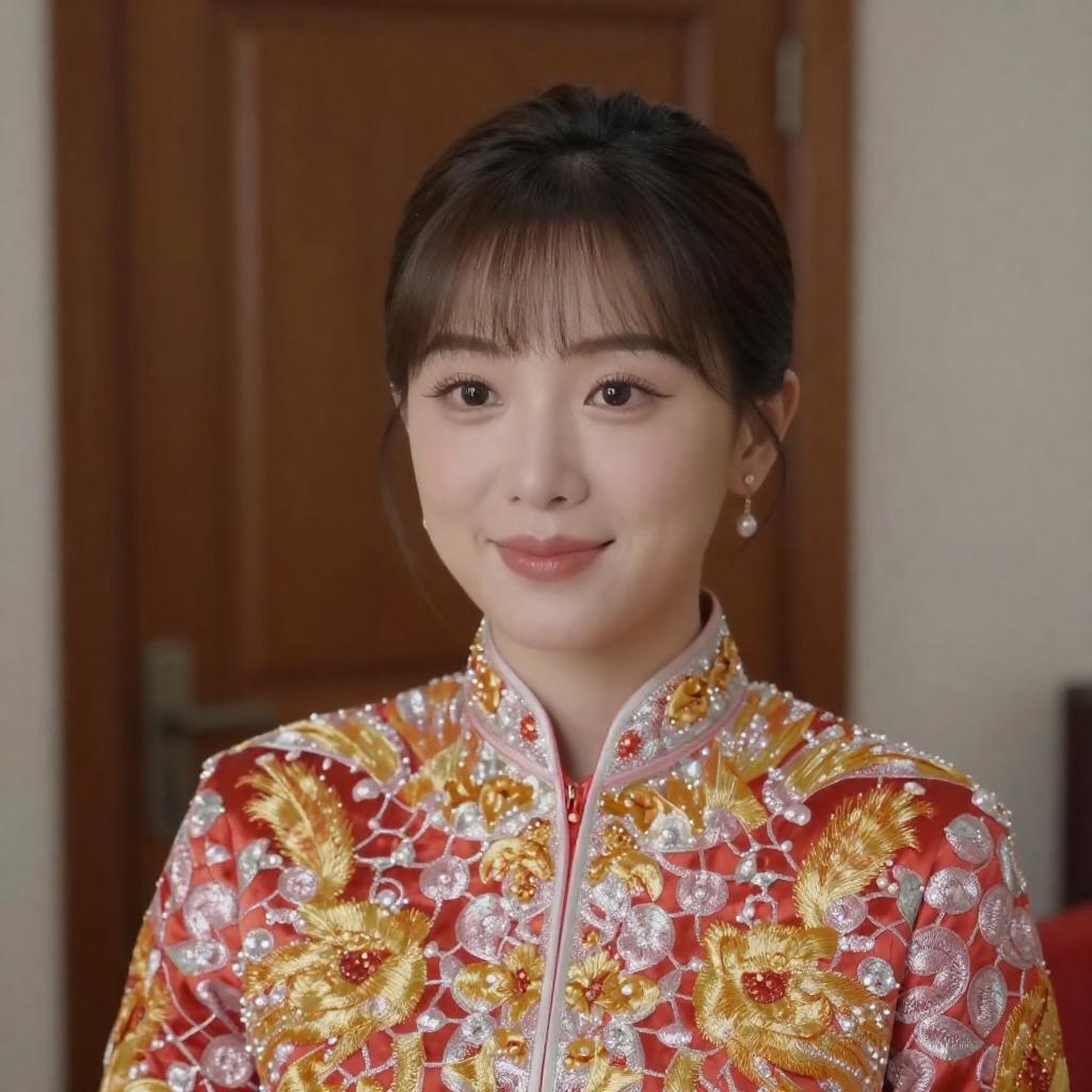 Photograph of a woman with shoulder-length brown hair, wearing a floral dress, smiling softly in the foreground. A maid in a gray dress and white apron with a white cap stands in the dimly lit background. Dark wood door frame on the left, purple flowers on a table on the right.