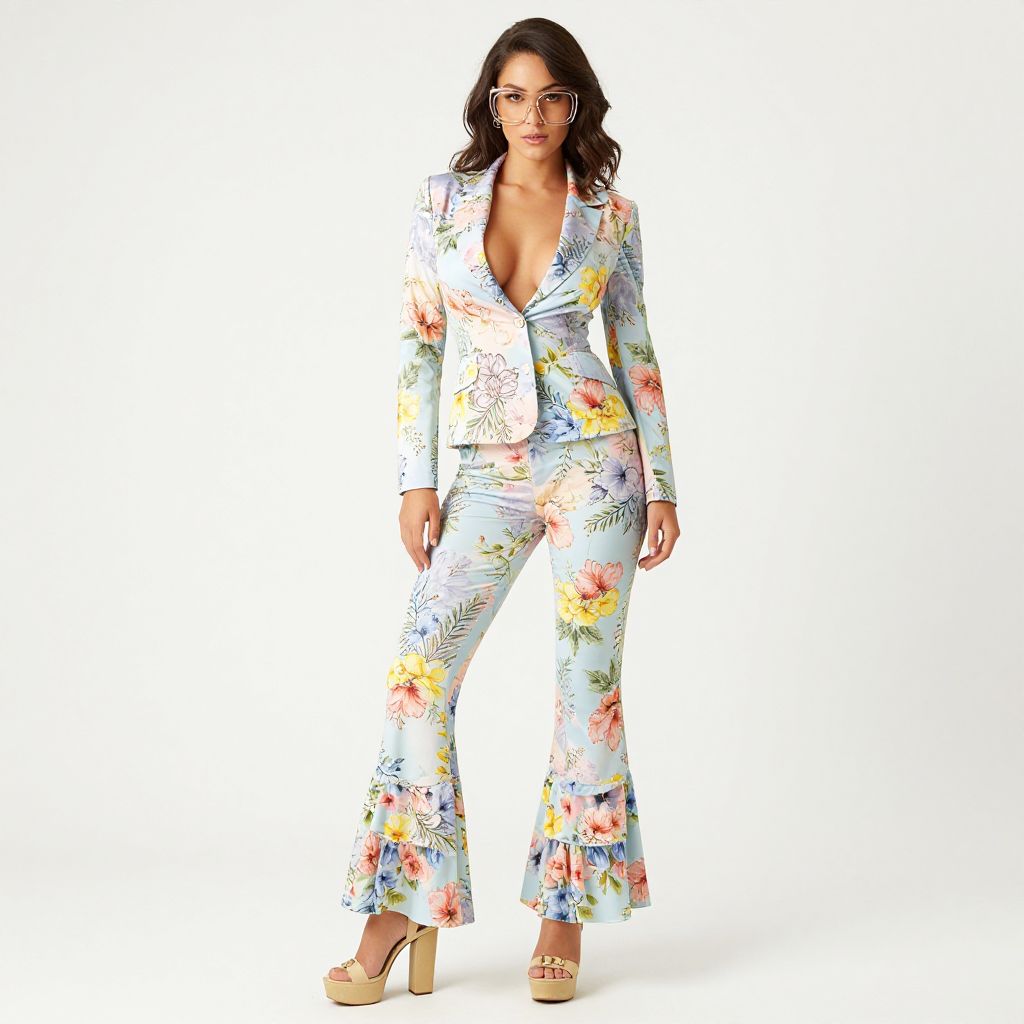 "Woman, vintage-inspired, floral print pantsuit in pastel shades, fitted blazer with notched lapels and single-button closure, bell-bottom trousers with ruffled hem in contrasting floral pattern, oversized clear eyeglasses, platform sandals with chunky heels and gold buckles, white background.. Sexy. Pretty face and beаutiful eyes. Big breasts."