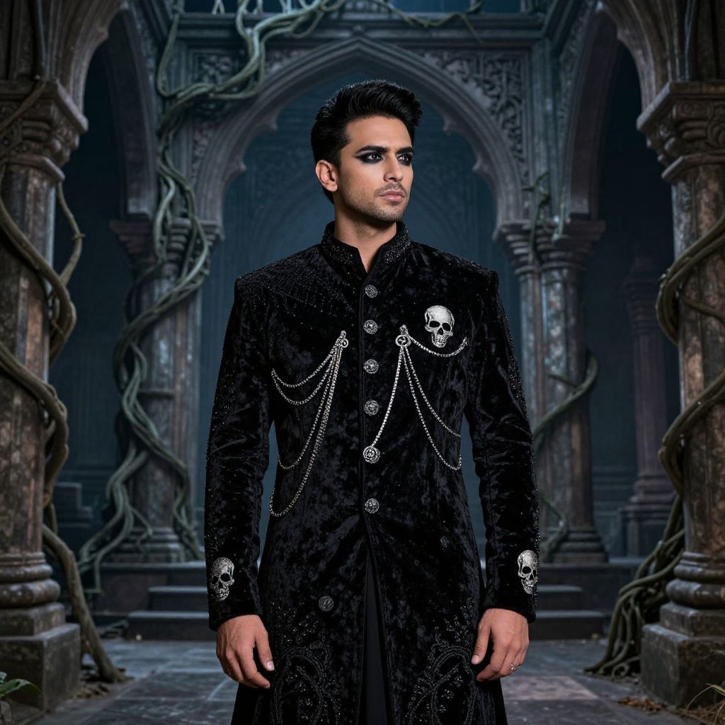 Goth Indian man wearing a black velvet sherwani with skull motifs, silver chains, and dark eyeliner, standing in a moonlit ancient temple with twisted vines and gothic arches, surreal mood, highly detailed.