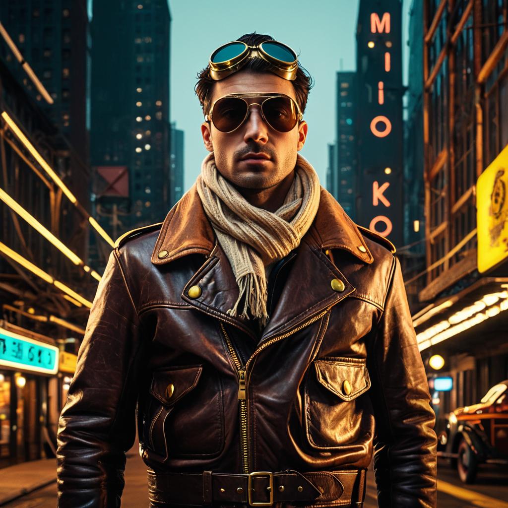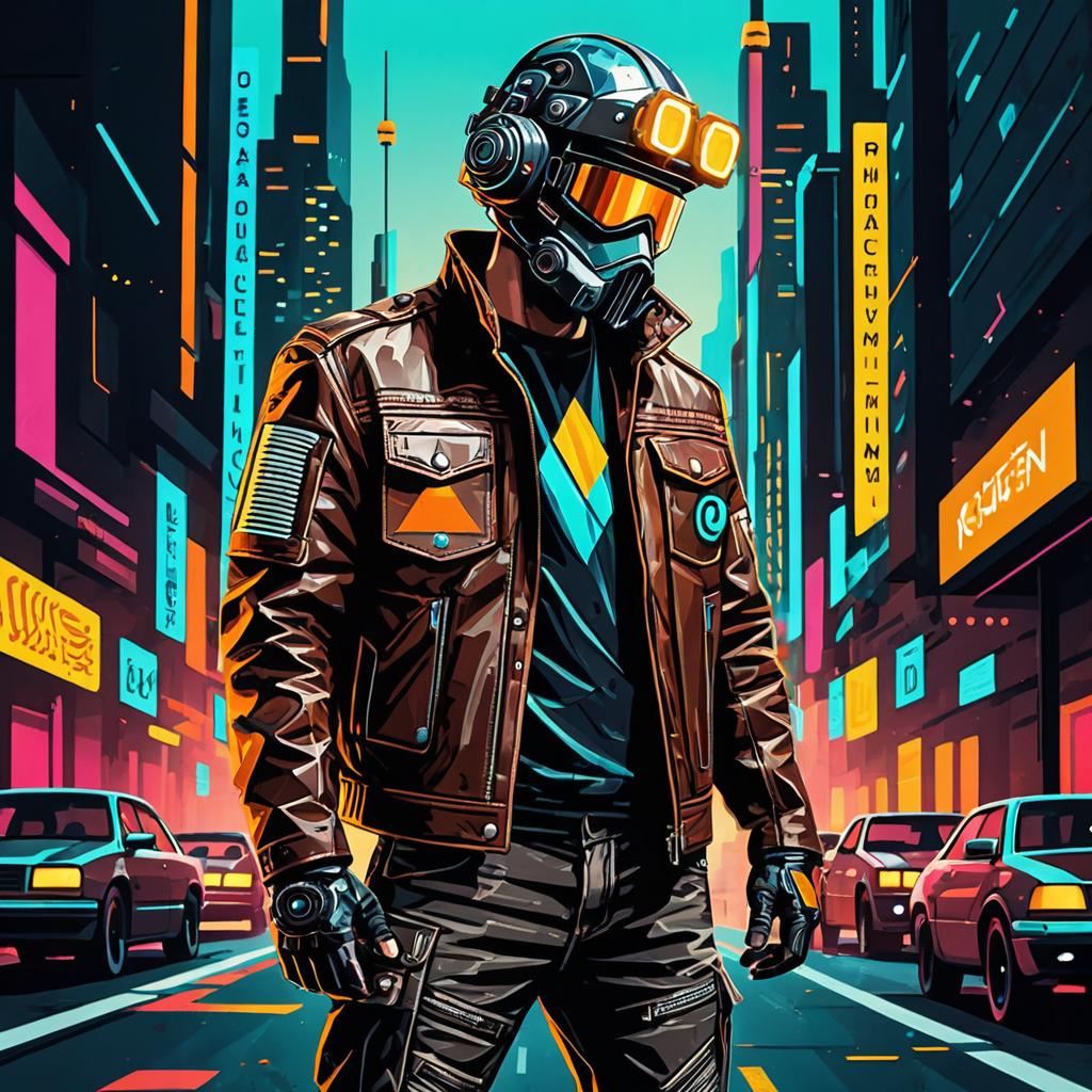 Retro cyberpunk mechanic man wearing worn brown leather jacket with a glowing circuit emblem tee underneath and distressed dark cargo pants and steampunk visored helmet with illuminated lenses, standing under neon-lit cityscape lighting, photorealistic, ultra-detailed --sref 1420