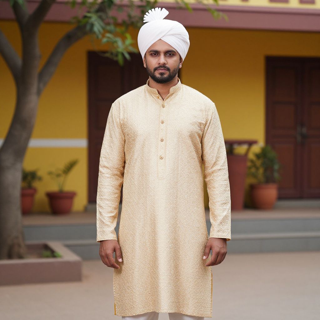 Photograph of a South Asian man standing outdoors, wearing a white turban and a long, beige, embroidered kurta. He has a short black beard and dark skin. The background features a yellow building with brown doors, potted plants, and a tree on the left. The man is centered in the frame, looking directly at the camera with a neutral expression. The image has a sharp focus on the man, with a slightly blurred background. The lighting is natural, highlighting the textures of his clothing and the building.