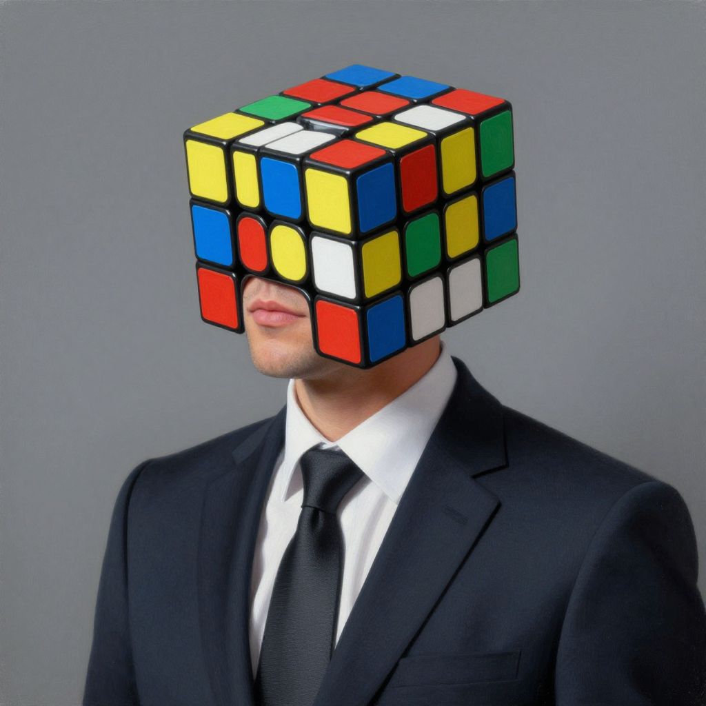 Hyper - realistic hyper - detailed fine painting of a man dressed in a suit and with a rubik's cube instead of a head, ultra - realistic detailed surrealism, magical realism