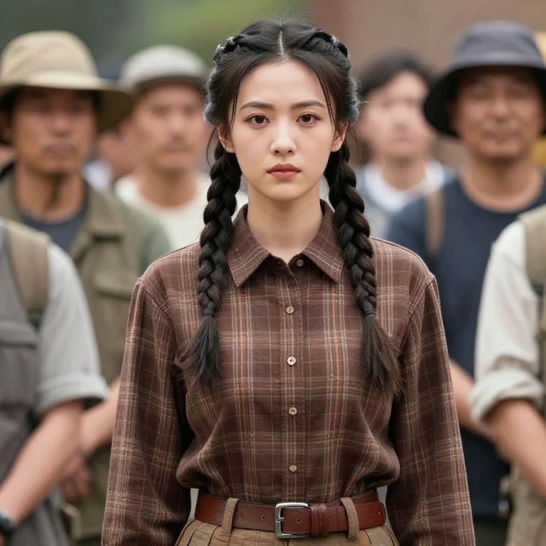 Female wearing a brown jacket with a blue scarf and a brown cowboy hat.