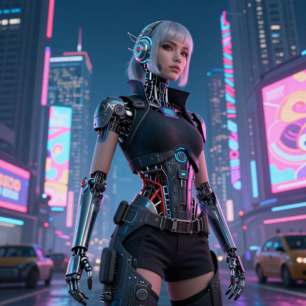 Cyberpunk woman with silver bob, robotic arms, and torso stands in neon-lit city street, wearing black shorts and futuristic armor.