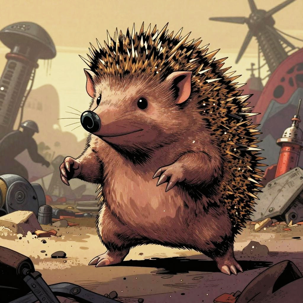 A nazi hedgehog depicted in comic book art style, dynamic pose, vibrant colors, exaggerated expression, dystopian war zone backdrop, intense atmosphere with graphic detail