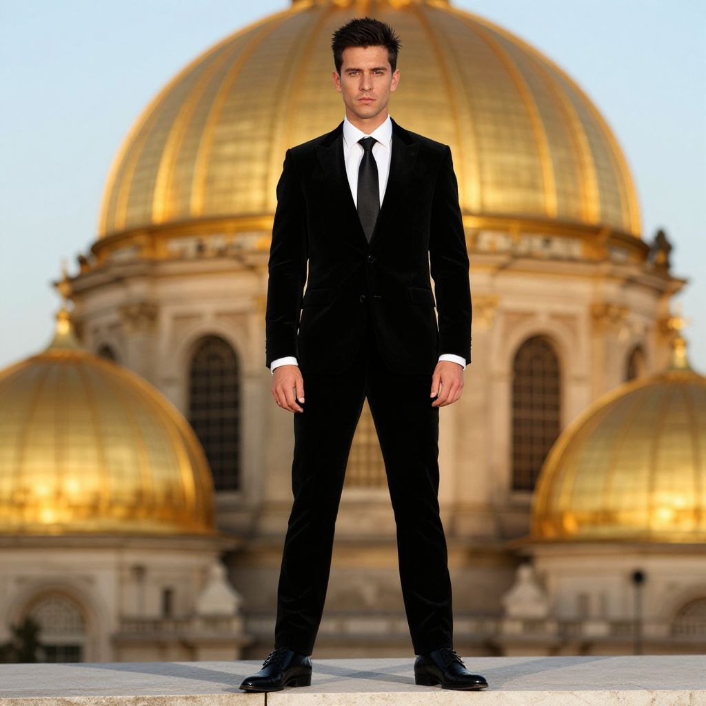 A man, tailored black velvet suit, crisp white dress shirt, sleek black leather shoes, matching black silk tie, polished silver cufflinks, majestic domes reflecting golden sunlight, pinhole camera style, confident expression. Man has masculine face and piercing eyes
