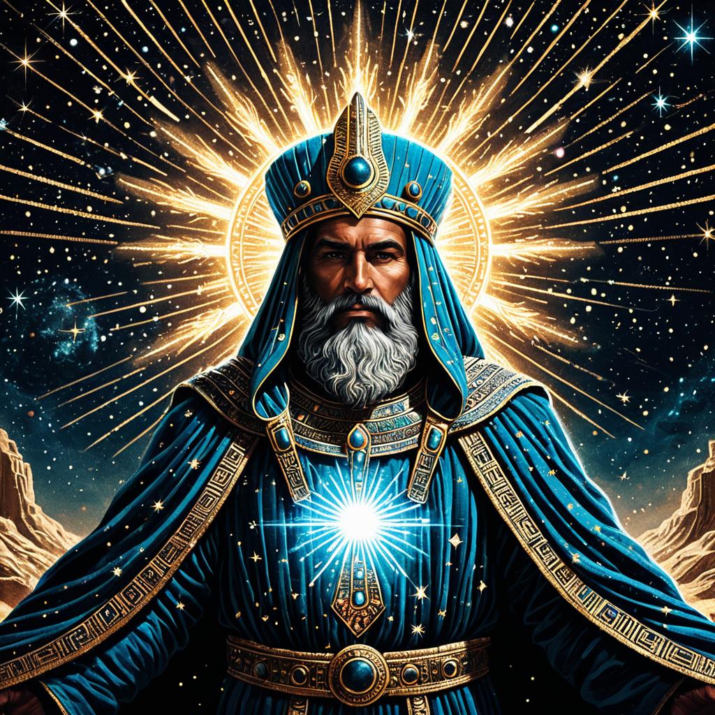 Anu – Sky father and supreme god of Mesopotamia, radiating power and clad in luminescent stardust-embroidered robes, surrounded by glowing divine energy in a dramatic fantasy illustration