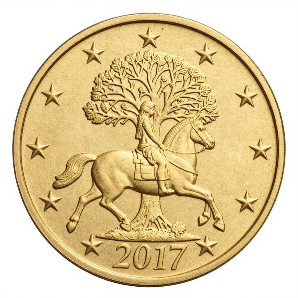 Gold-colored coin with a horse and rider under a tree, surrounded by stars, and the year "2017" at the bottom.