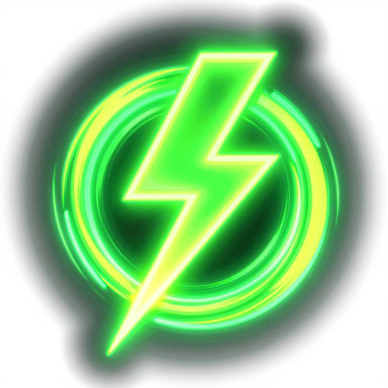 A digital, neon-style illustration features a bright green, glowing lightning bolt with a yellow edge, positioned diagonally across a black circular background. The circular background is surrounded by a green and yellow ring of light, creating a halo effect. The image has a white, blurred outer edge, enhancing the neon glow. The overall style is futuristic and energetic, with high contrast and vibrant colors. The lightning bolt and circular ring appear to be in motion, giving a dynamic and electric feel to the image.