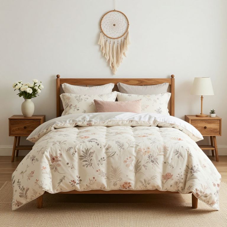 Cozy bedroom featuring a wooden bed adorned with a floral-patterned duvet set in soft pastel hues, complemented by layered pillows and flanked by rustic bedside tables, one holding a vase of white flowers and the other a lamp, all set against a serene backdrop with a dreamcatcher above and a woven rug beneath.