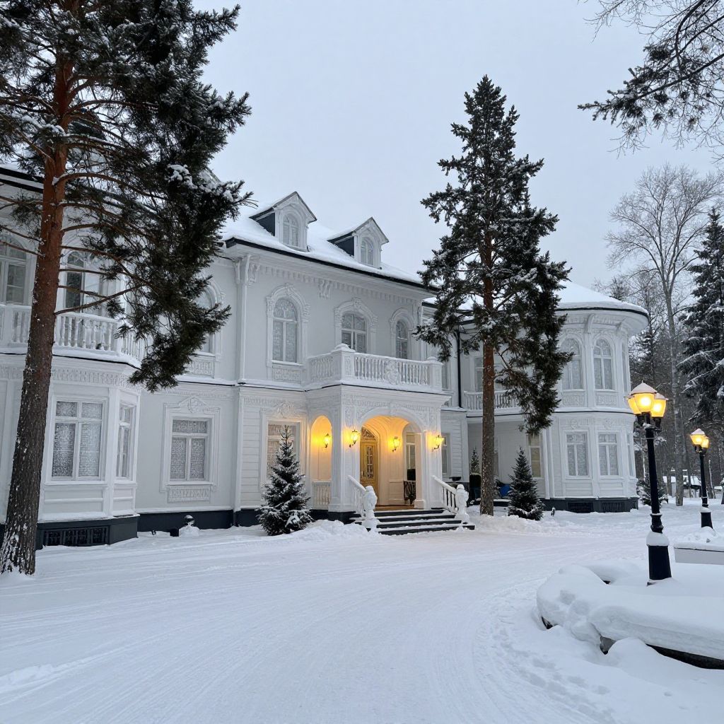 Rublyovka Russia wintertime luxury, snow-covered mansions with frosted windows and elegant entrances, cozy ambient lighting from street lamps, tall pine trees, pristine white snow blankets the area, serene and exclusive vibe