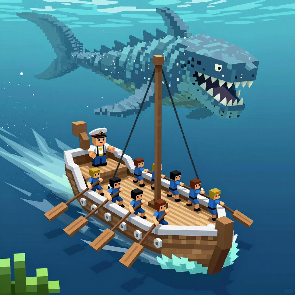 Exposure Bracketing Create a voxel-style concept art for a cooperative multiplayer game set in a submerged world 1000 years in the future. The scene should depict a galley ship powered solely by oars, with no sails, sailing across the vast ocean, being chased by a massive sea monster. The ship should have a captain player character and numerous crew members actively rowing with oars, showcasing cooperation and teamwork. Capture the tense atmosphere and the excitement of the pursuit.,