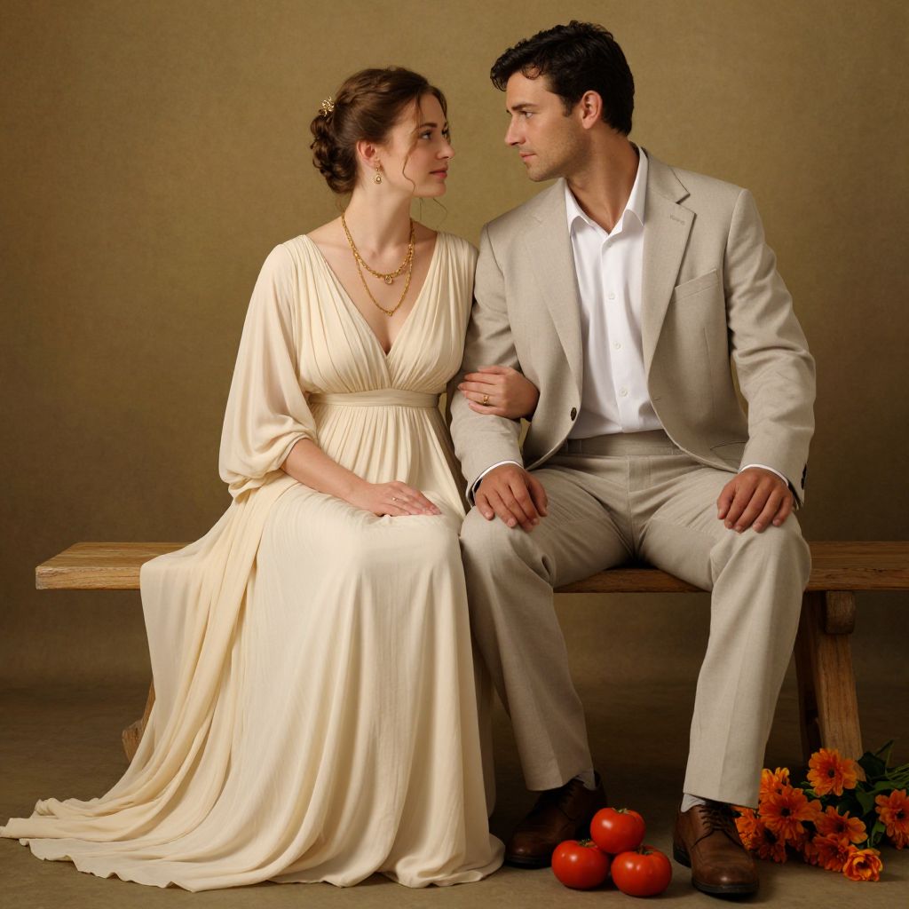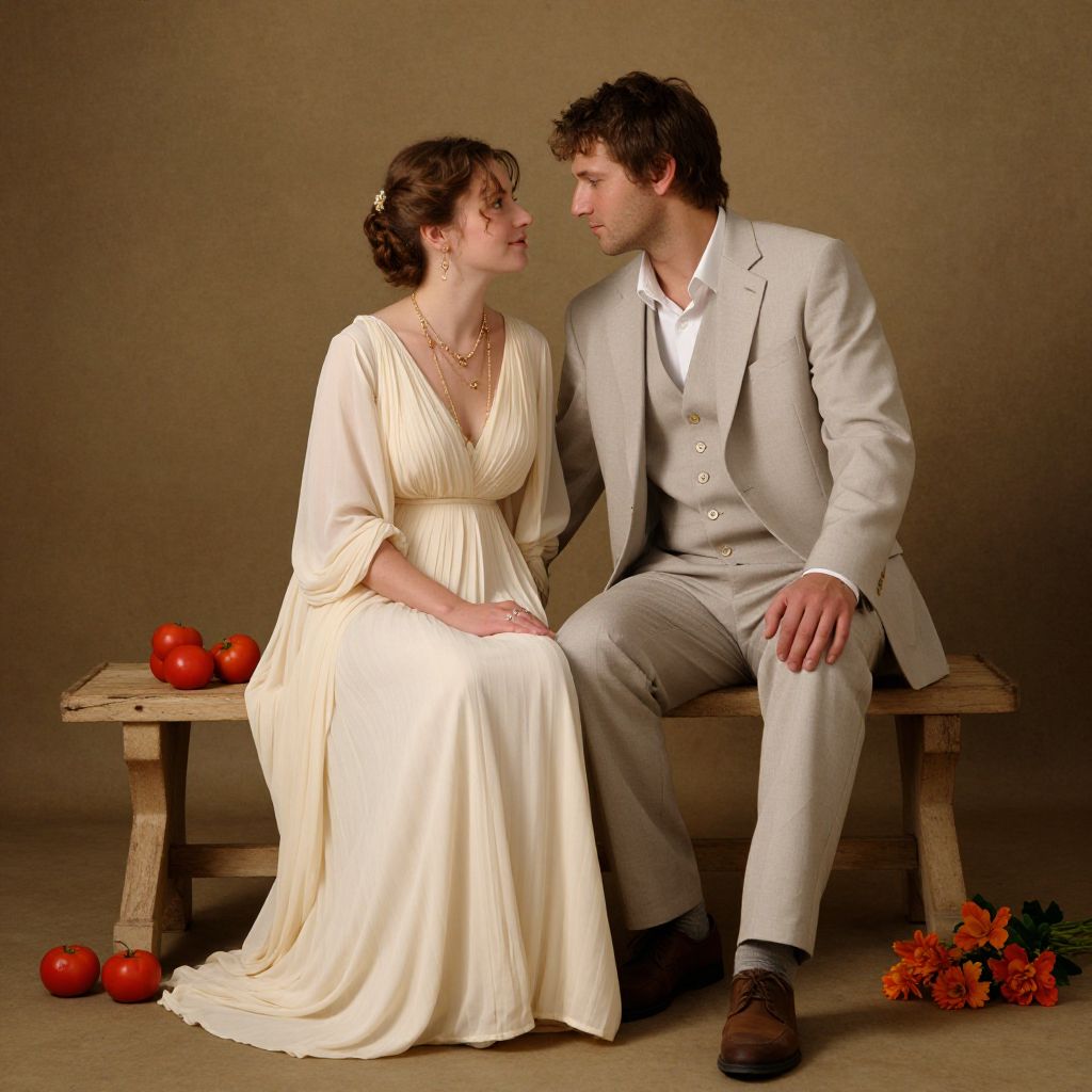Romantic scene depicted in classical style, featuring two individuals seated on a wooden bench, with a woman in a flowing cream gown adorned with a gold necklace and earrings, and a man in a light beige suit, both gazing tenderly at each other, surrounded by a warm, earthy backdrop and accented by vibrant red tomatoes and orange flowers resting on the floor below.