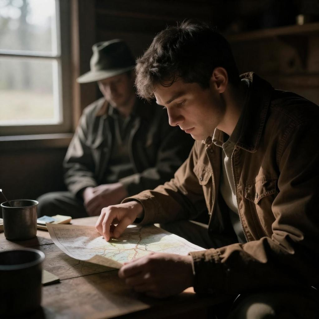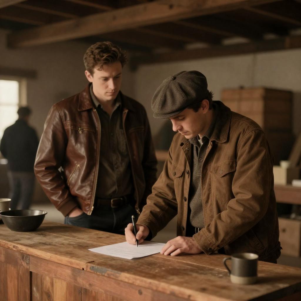 Photograph of two men in a rustic, wooden warehouse. The man on the right, wearing a flat cap and brown jacket, stands at a wooden counter, writing on paper. The man on the left, in a leather jacket, stands with hands in pockets, looking at the writer. Background includes blurred figures and wooden crates. Warm, sepia-toned lighting.