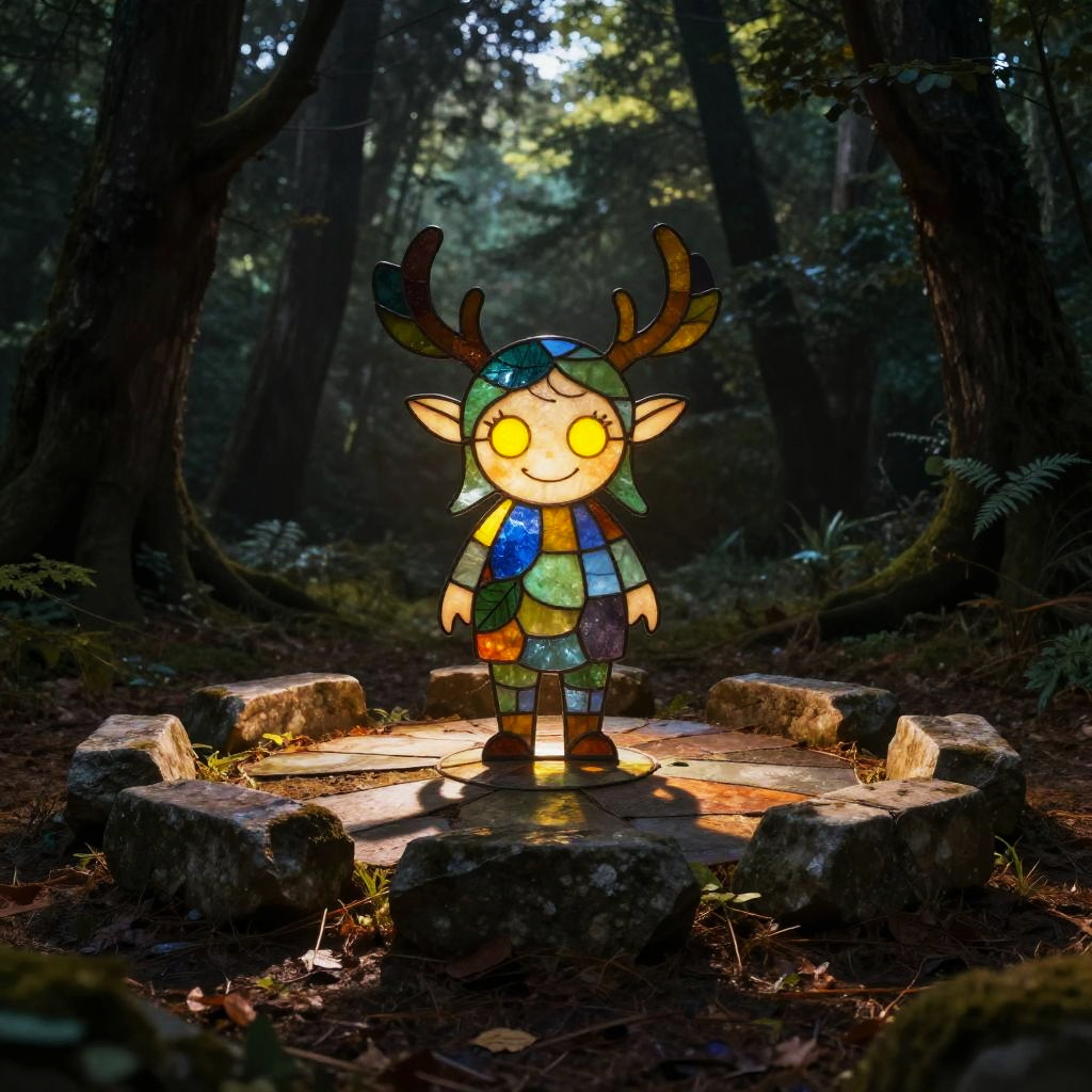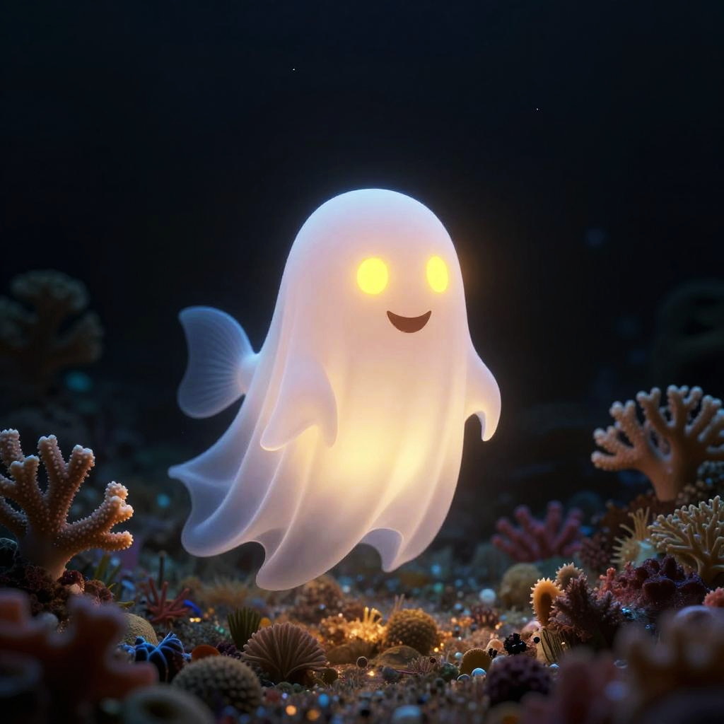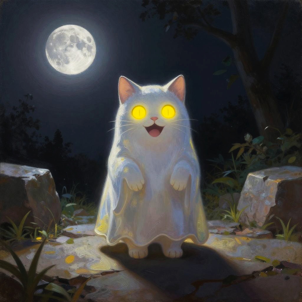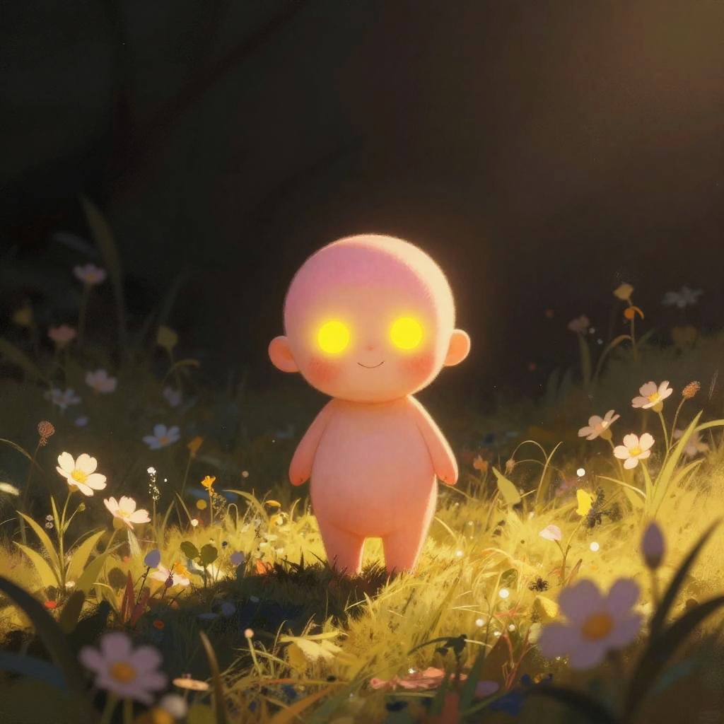 A pixel art of a tiny flame-spirit with flickering tendrils, standing on an ancient burning library with charred books. Soft green glowing eyes and a serene smile create a spooky-yet-charming vibe. High contrast lighting, warm bloom against deep blacks, soft rim light, long dramatic shadows, centered composition, negative space, subtle film grain, clean render, crisp edges, gentle vignette, volumetric haze.