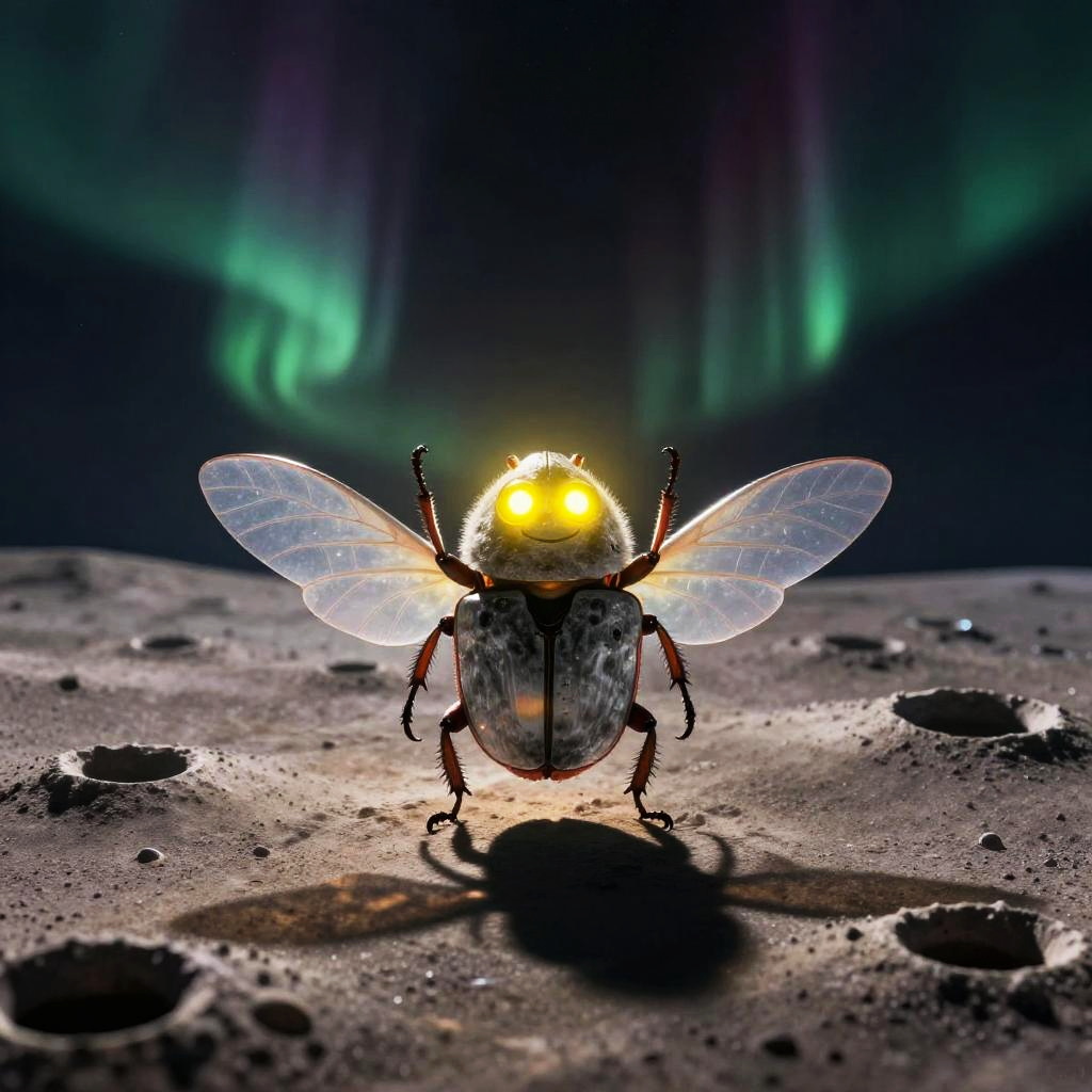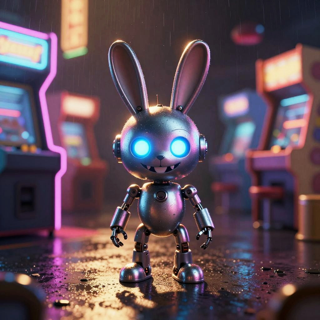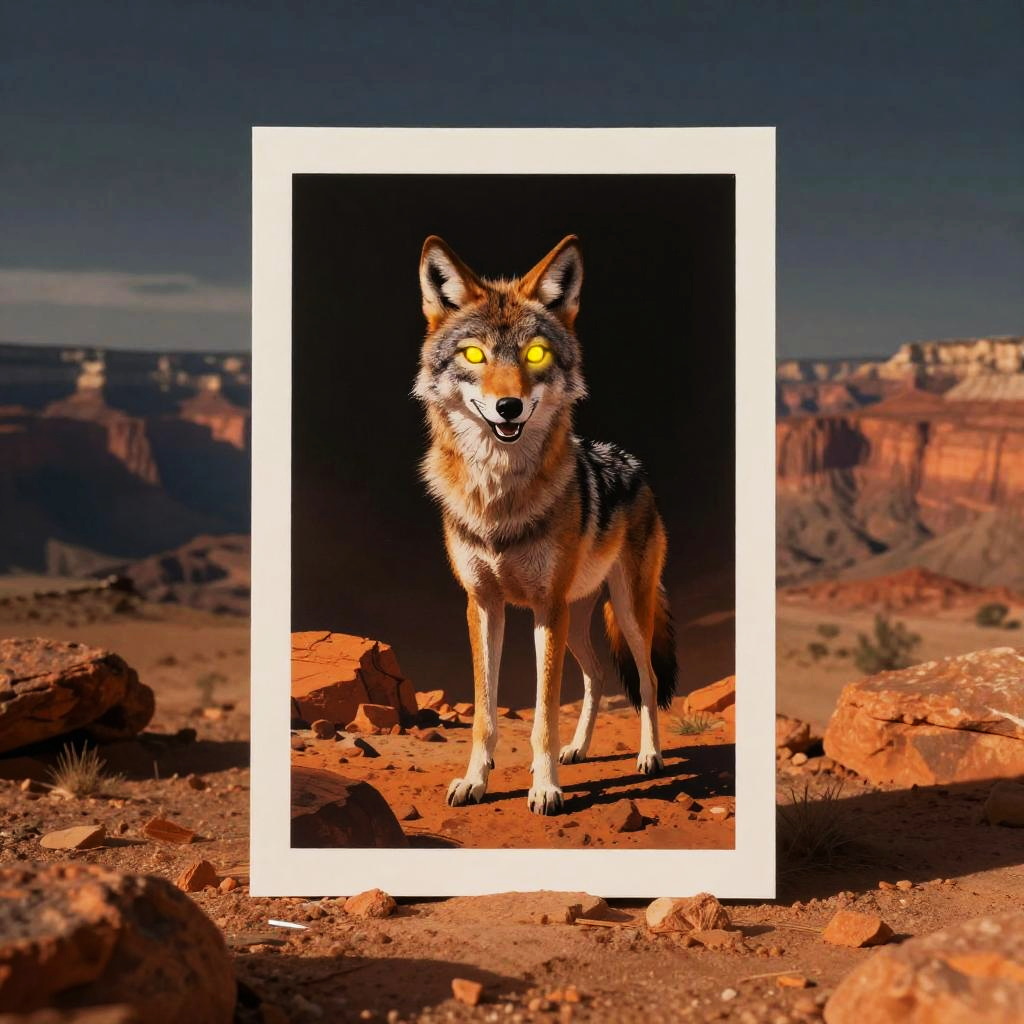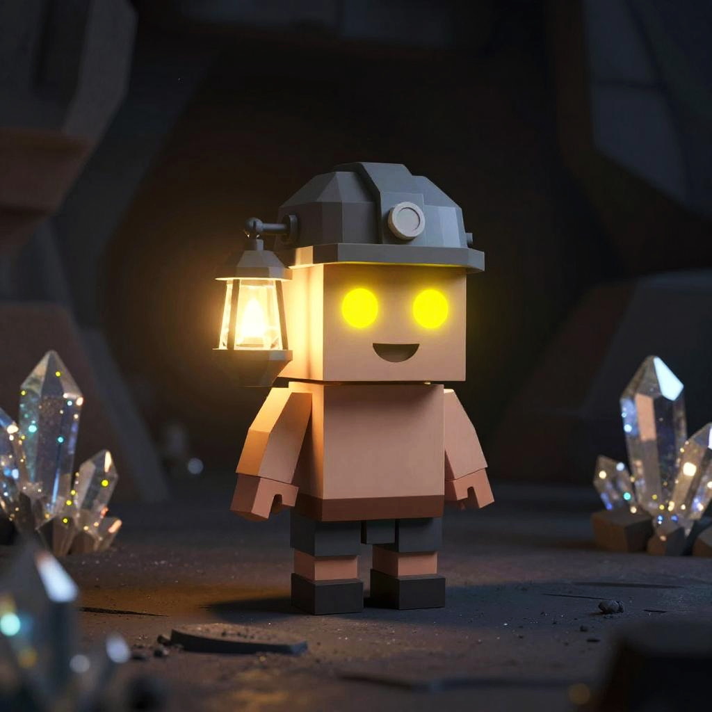 Digital artwork of a pixelated, glowing, orange fire-like creature with green eyes, standing between two stacks of books in a dimly lit, ar