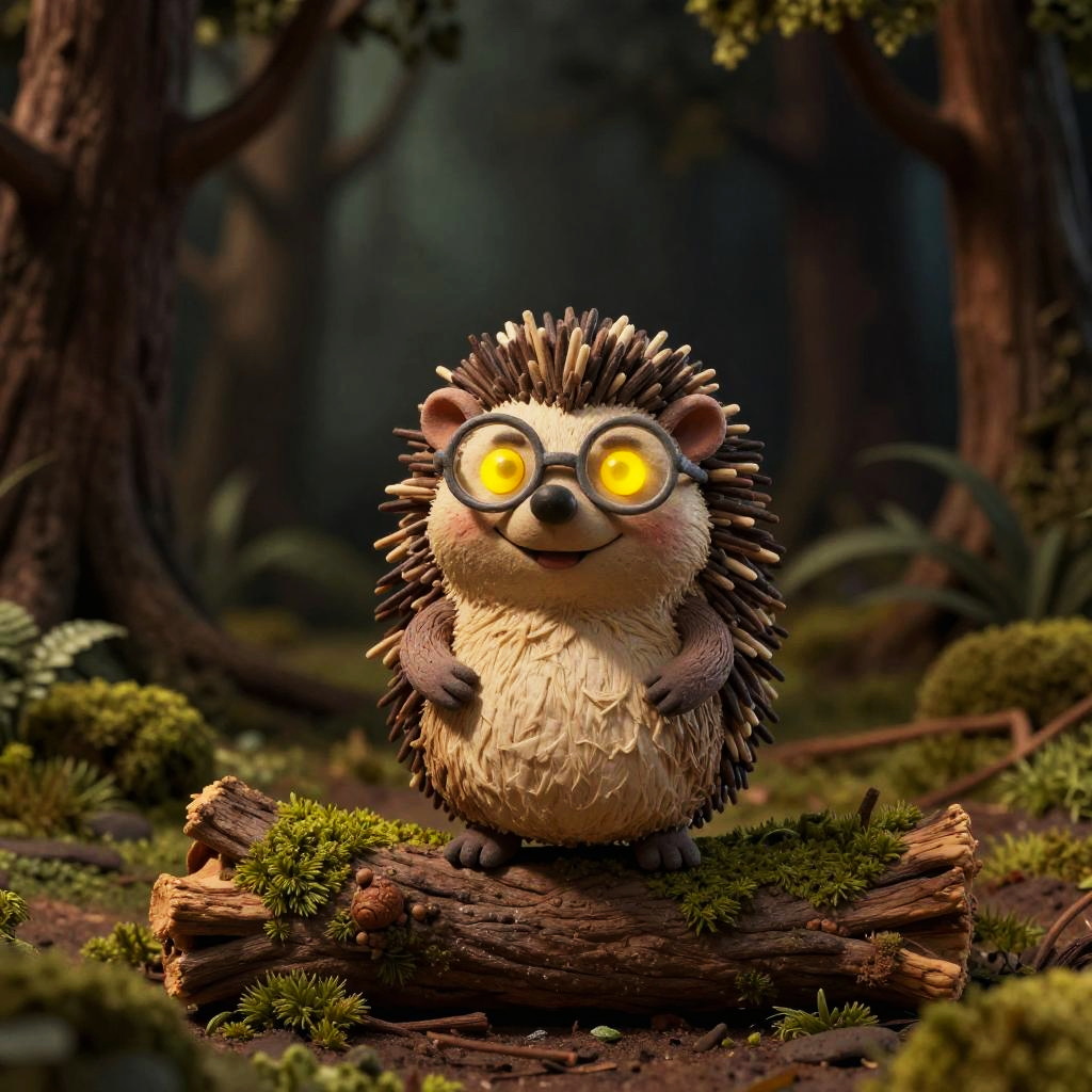 Photograph-style CGI image of a pixelated, fire-shaped character with glowing green eyes and a small, smiling mouth, standing in the center of a dimly lit library. The character emits bright, warm light, illuminating stacks of books on either side. The background features tall, dark bookshelves and arched windows, with scattered paper and debris on the stone floor. The library's atmosphere is mysterious and slightly cluttered, contrasting with the bright, cheerful fire character. The image combines realistic lighting with pixel art elements.