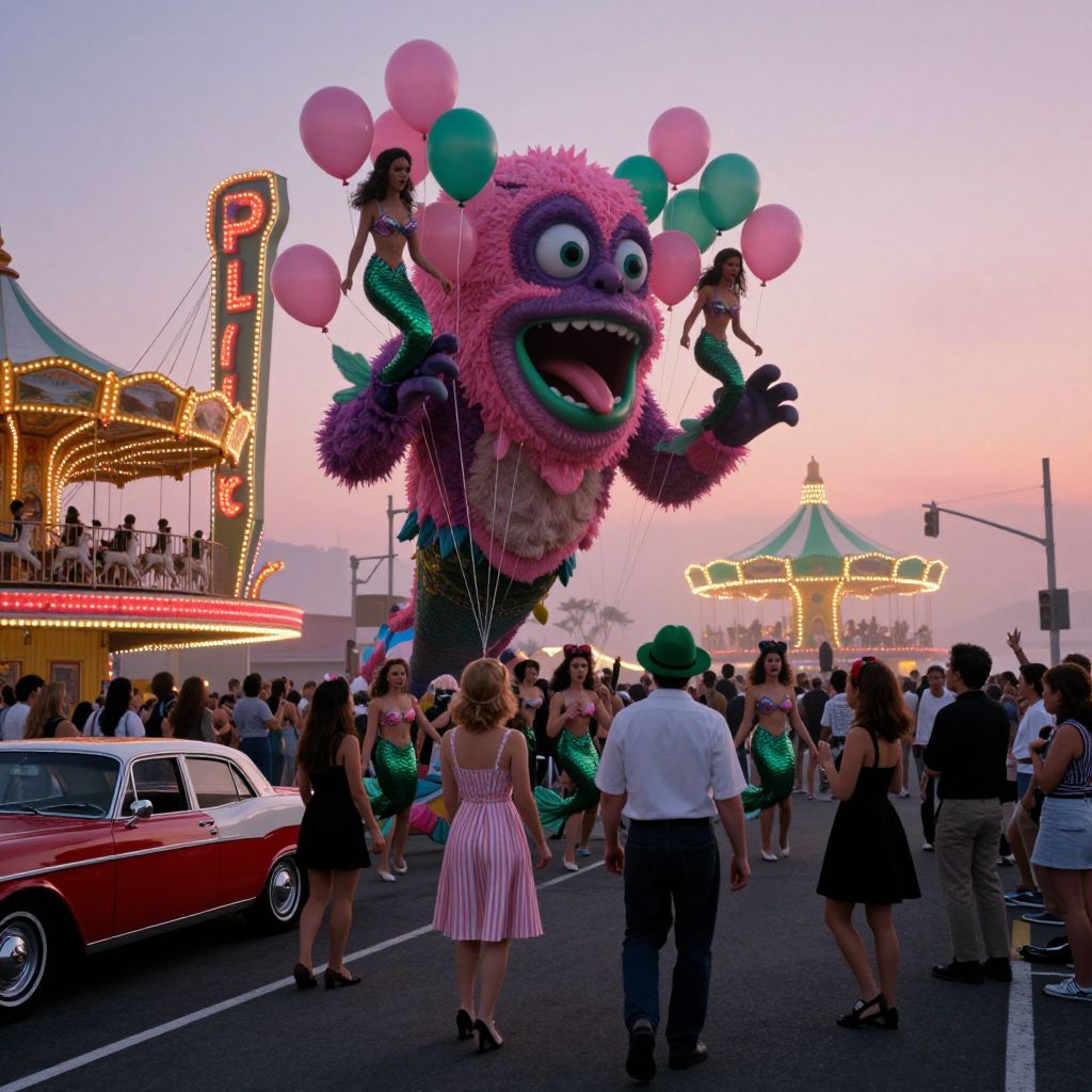 In the heart of a dark, foggy sunset in 1960s Coney Island, the mermaids parade takes a turn for the unexpected as the festive mermaids balloons suddenly come to life, transforming into monstrous creatures and causing chaos and panic among the spectators. Directed in the whimsical style of Wes Anderson, this photo-realistic sci-fi thriller blends the fantastical with the mundane, creating a unique and unforgettable experience. The scene is set against a backdrop of a neon-lit theater marquee, with a green and white carousel visible in the distance. A large, pink, and purple monster with a green mouth and eyes, adorned with pink and green balloons, dominates the foreground. A woman in a striped dress and a man in a green hat walk towards the monster, while a woman in a black dress stands nearby. A red and white car is parked on the left, and a traffic light is visible in the background. The overall composition is intricate, with the monster's monstrous features and the spectators' reactions creating a sense of tension and wonder. The colors are vibrant and rich, with the pink and purple of the monster contrasting against the green and white of the carousel and the black and white of the spectators. The textures are hyper-realistic, with the monster's skin appearing rough and the balloons appearing soft and fluffy. The spatial relationships are complex, with the monster towering over the spectators and the carousel in the background. The scene is shot in 8K resolution, with a depth of field effect that adds to the realism and immersion.