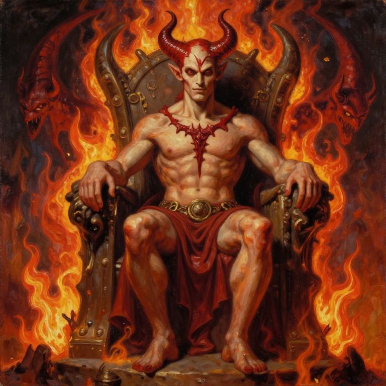 Spongy handsome satan on his throne in hell, full body, front view, flames demons, vintage fantasy art, oil painting,