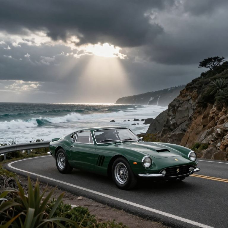 Classic dark green Ferrari on a coastal cliffside highway, ocean waves crashing below, dramatic stormy sky with rays of sunlight breaking through clouds, vintage car style, atmospheric and moody scene.