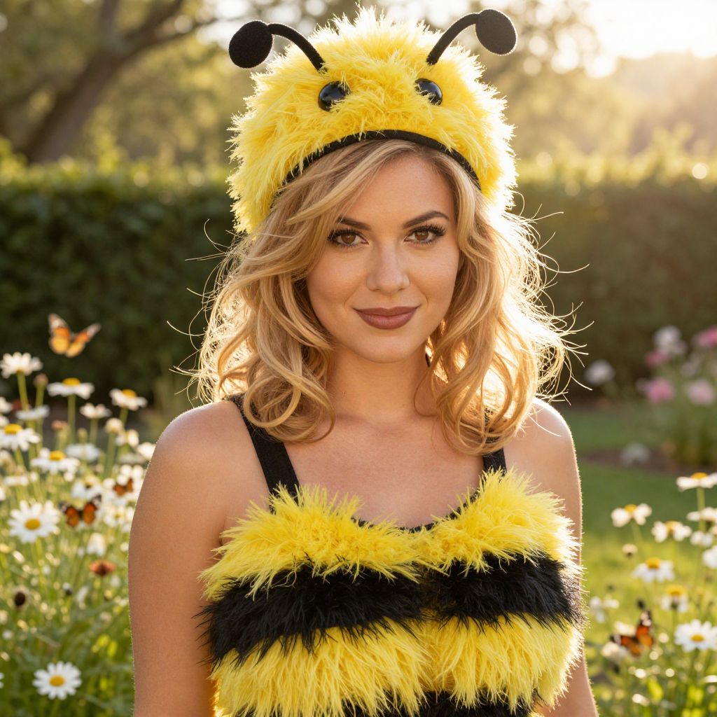 A close-up realistic photograph of a woman in a vibrant 'Bee Movie' costume, dressed as a honeybee with detailed yellow and black patterns, fuzzy hair and a bee-shaped hat, standing in a sun-drenched garden with flowering daisies and butterflies in the background. She has soft brown eyes, a natural smile, and slightly tousled blonde hair that catches the sunlight. The setting is outdoors during early spring, with bright green foliage and warm golden hour lighting.. The woman has big breasts and cute face