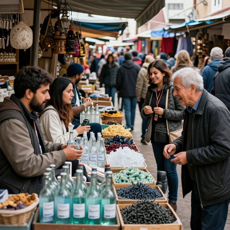 A bustling marketplace where merchants sell bottled silence, frozen gasps, and prickles of laughter harvested from dreams.