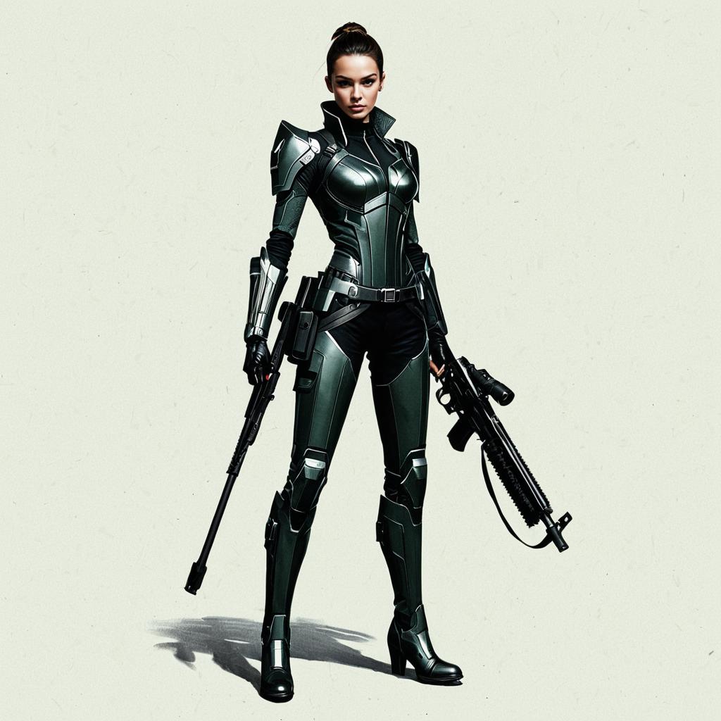 Full body digital painting of a futuristic female hunter android with sleek metallic armor. She has a high-tech, armored suit with protective plating and wears high-heeled boots. The android holds two futuristic rifles and stands confidently against a plain background. The artwork features a painterly style with a steely, sci-fi design.