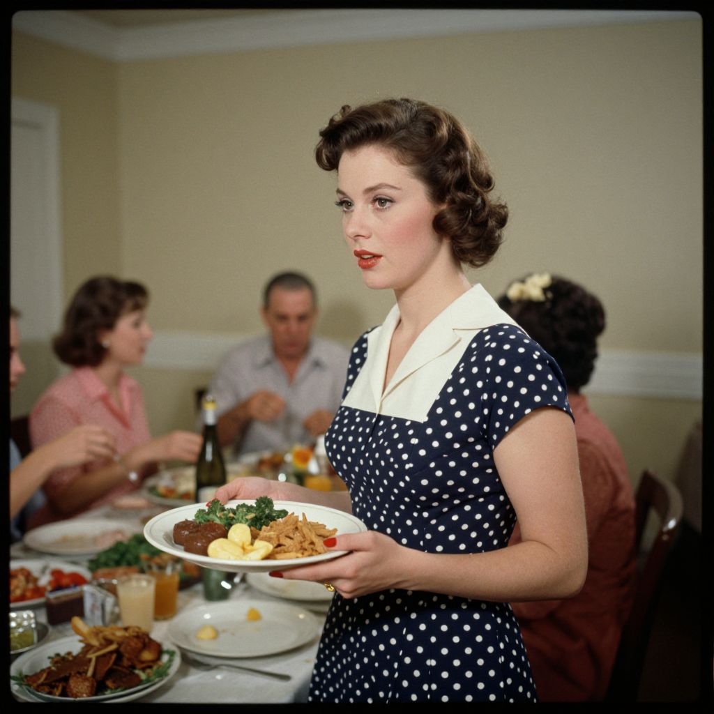 Photograph of a 1950s-style dinner scene featuring a fair-skinned, dark-haired woman with vintage curled hair and red lipstick, wearing a navy blue polka dot dress with a white collar. She holds a white plate with roasted meat, mashed potatoes, and green beans. Background shows four people, two women and two men, seated at a table with various dishes, including a glass of orange juice and a bottle of wine. The room has beige walls with white trim, and the lighting is soft and warm, creating a nostalgic, retro atmosphere.