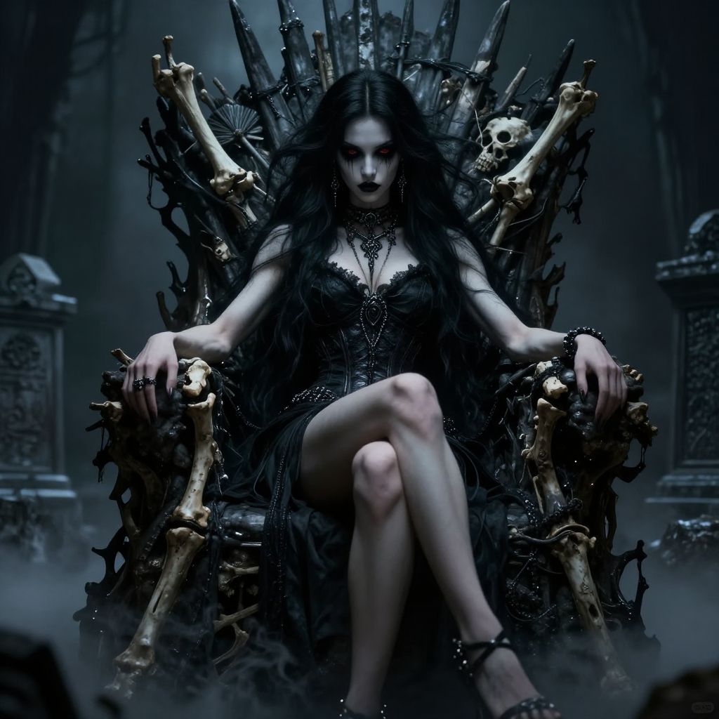 Digital artwork of a pale-skinned woman with long, black, wavy hair, sitting on a throne made of bone and skulls. She wears a black, lace, strapless dress with a deep neckline, adorned with intricate silver jewelry. Her legs are crossed, and she has a serious, intense expression. The throne is large and ornate, with numerous bones and skulls forming the backrest and armrests. The background is dark and misty, with faint, gothic architectural elements. The overall mood is dark, mysterious, and ominous, with a strong gothic and fantasy influence.