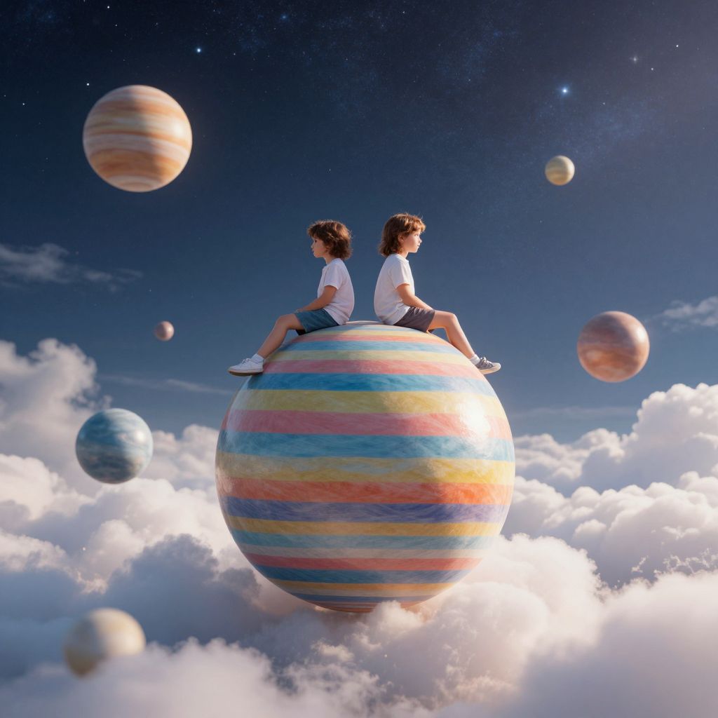 Two children sit serenely atop vibrant, striped spheres resembling oversized marbles, floating amidst fluffy clouds and a starry sky, as smaller celestial orbs drift around them in a dreamlike, surreal landscape.