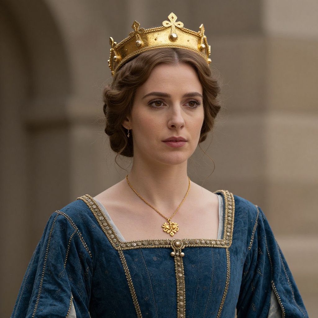 Photograph of a young woman with fair skin and brown, wavy hair styled in an elegant updo, wearing a gold crown with ornate details. She is dressed in a medieval-style, blue velvet gown with gold embroidery along the square neckline and sleeves. Around her neck is a gold necklace with a small pendant. Her expression is serious and focused. The background features a blurred, stone architectural setting, suggesting a historical or royal context. The image emphasizes her regal appearance and the rich textures of her clothing.