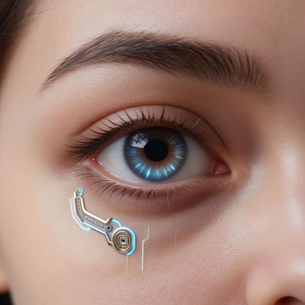 This is a highly detailed, close-up photograph of a human eye with a striking blue iris. The eye is surrounded by fair skin with a visible eyebrow above it, and long, dark eyelashes. A futuristic, metallic-looking device with a spiral design and wires is attached to the lower eyelid, emitting a faint blue glow and a single drop of fluid. The texture of the skin is smooth, and the photograph has a hyper-realistic style, emphasizing the intricate details of the eye and the device. The background is blurred, keeping focus on the eye and device.